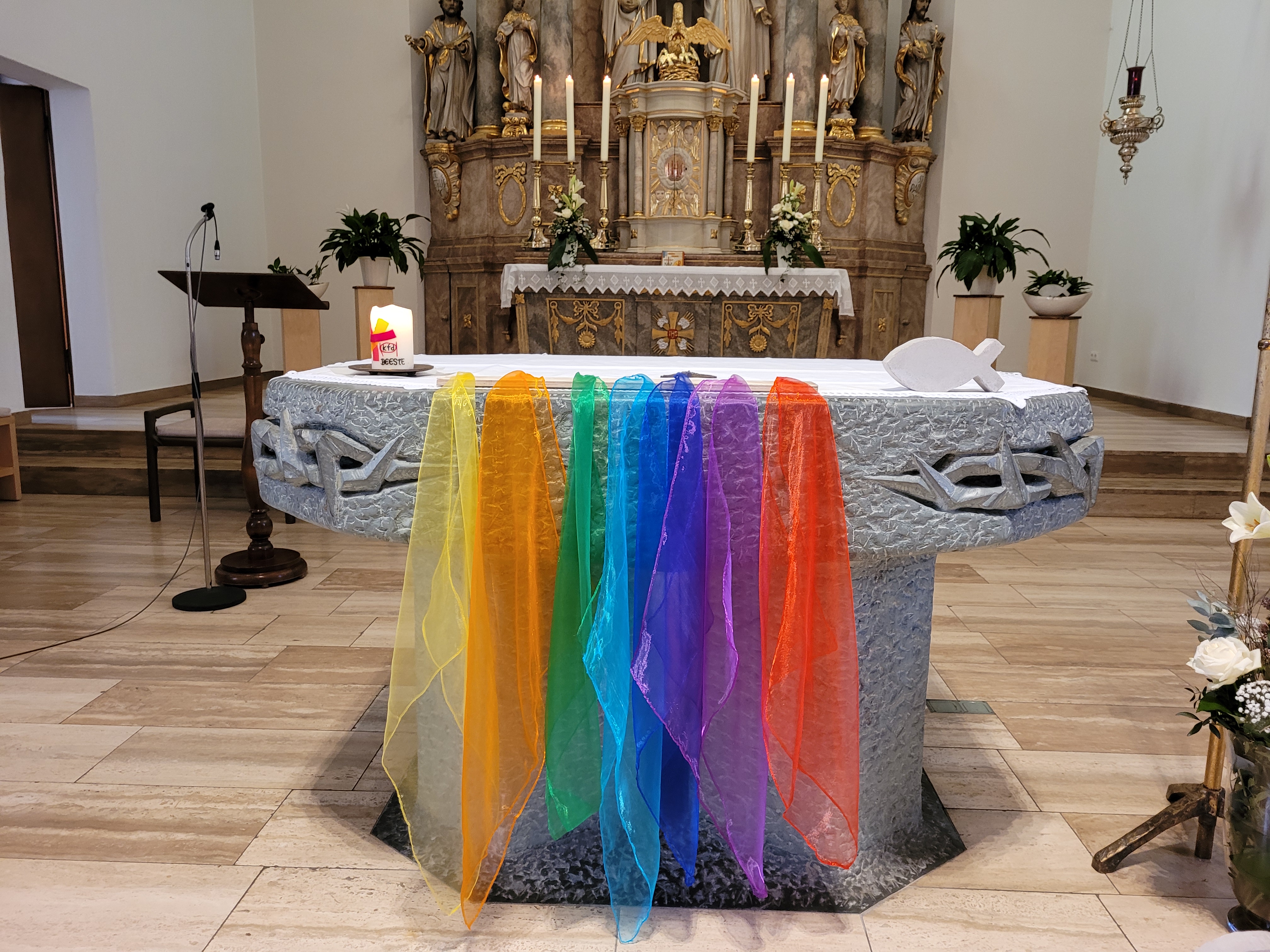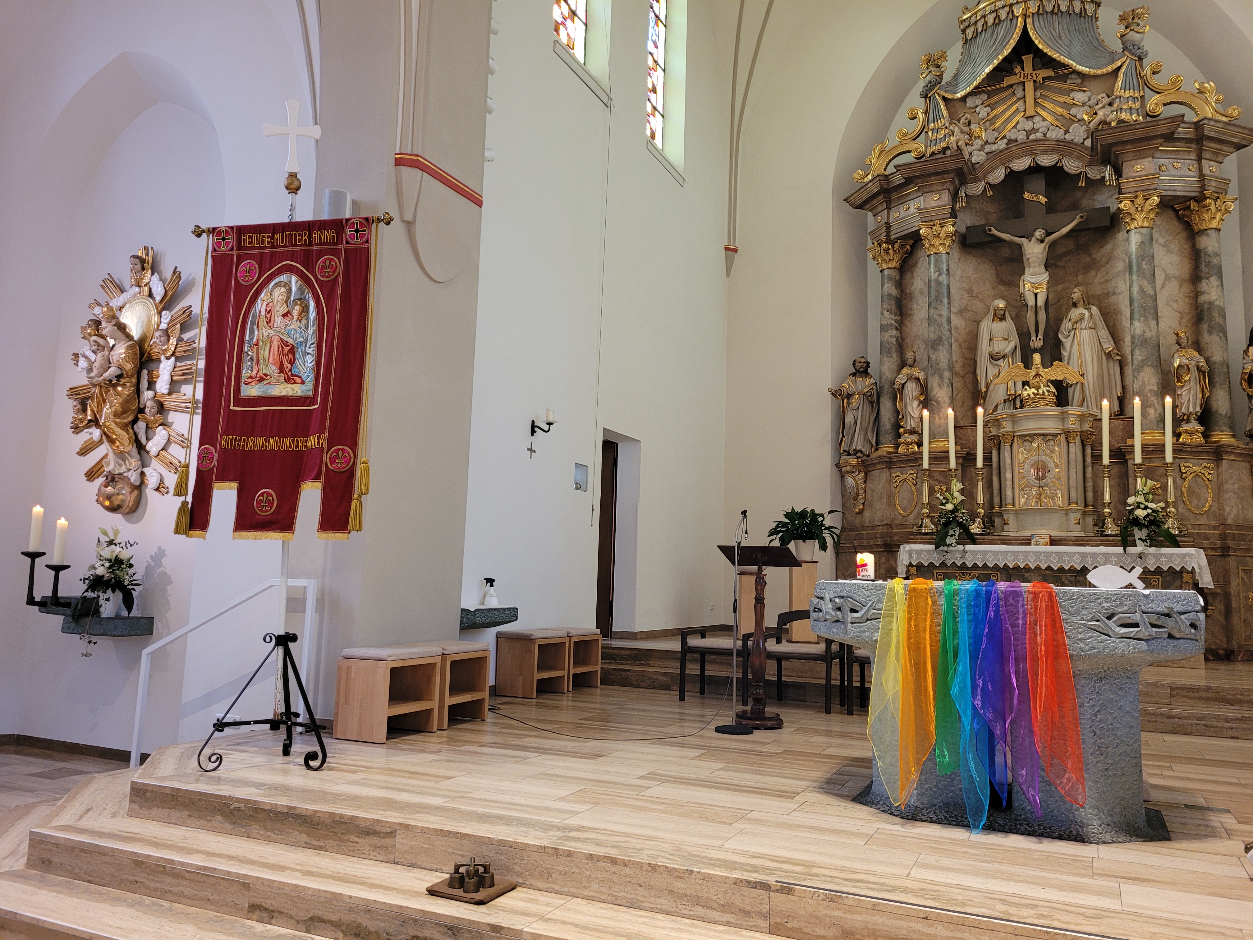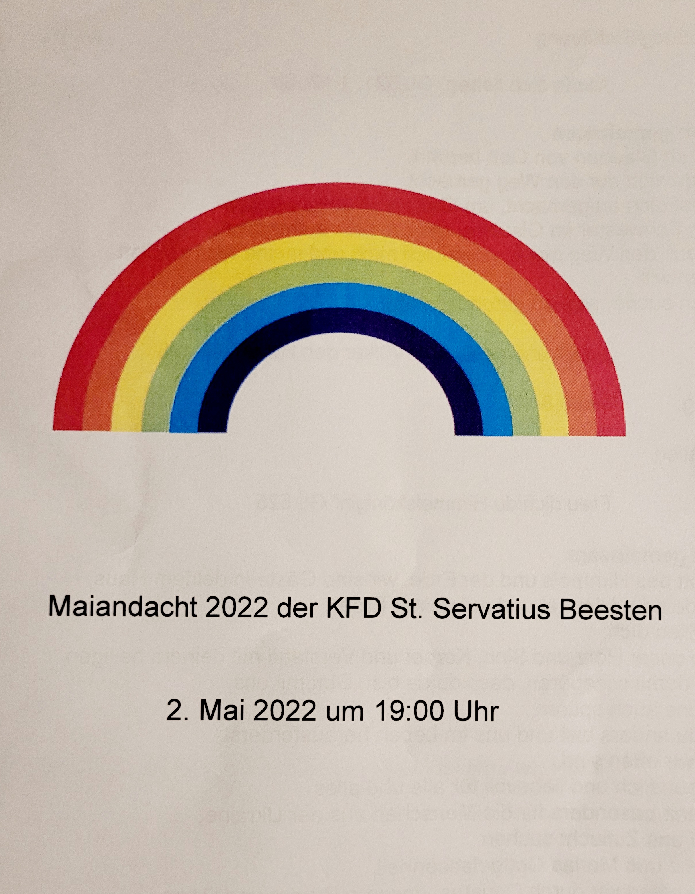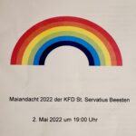 Am Montag, 2. Mai 2022 feierten die kfd-Frauen gemeinsam eine Maiandacht in der St. Servatius Kirche. Die Eva-Gruppe gestaltete die Maiandacht unter dem Zeichen des Regenbogens. Anschließend traf man sich im Michaelhaus zu einem kleinen Imbiss.