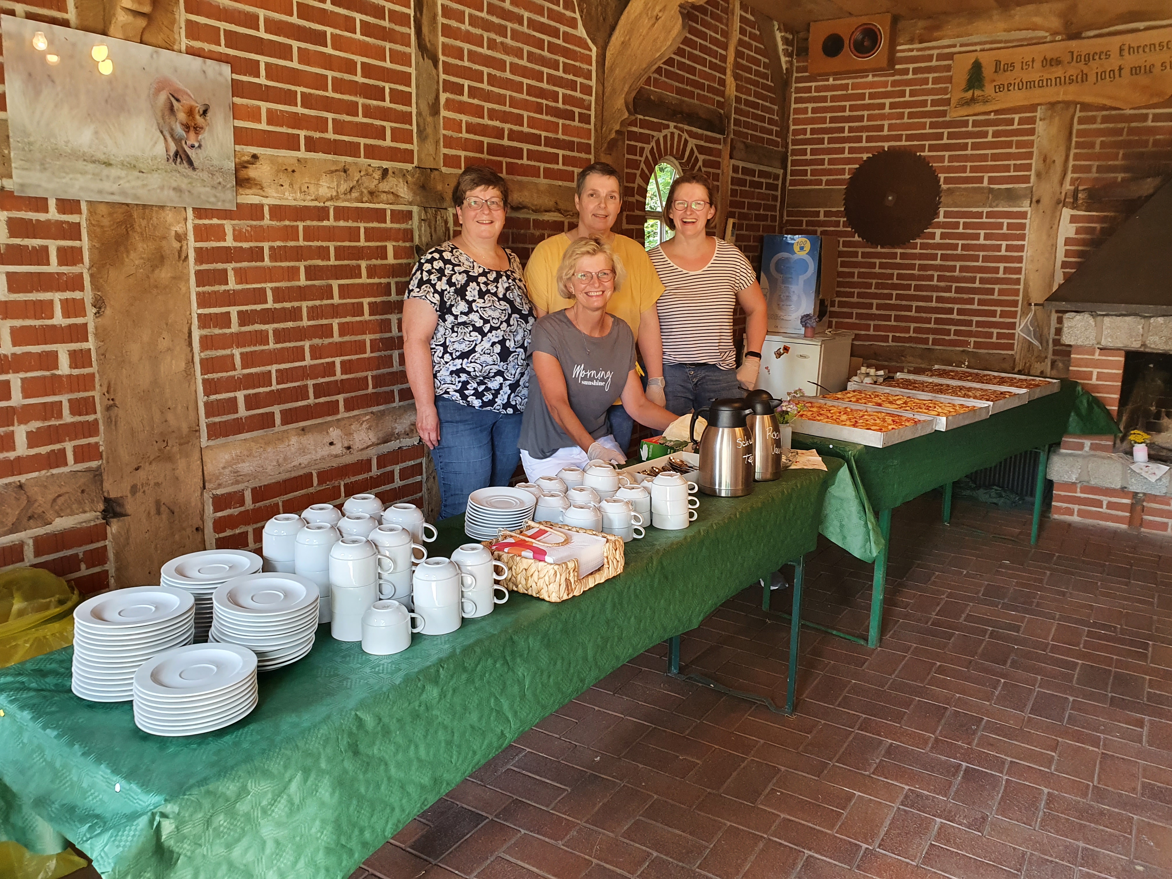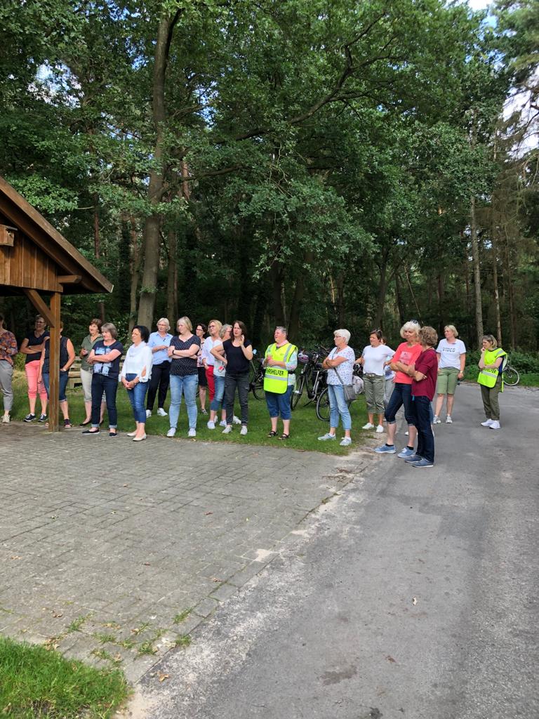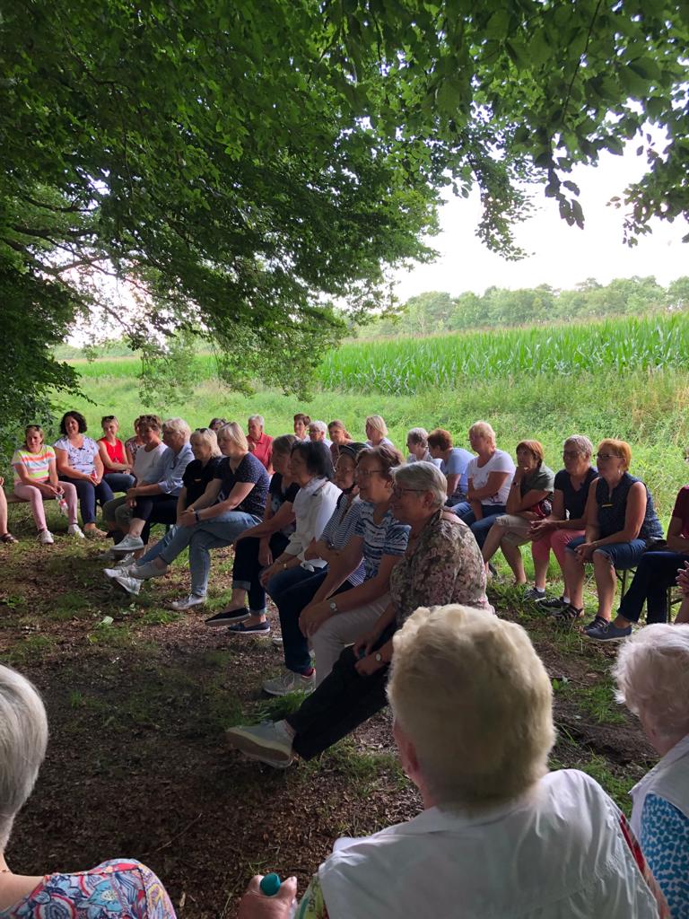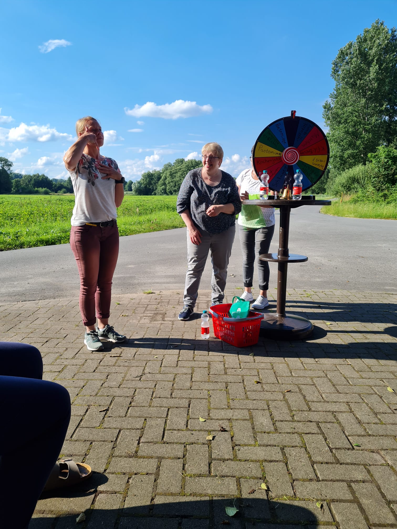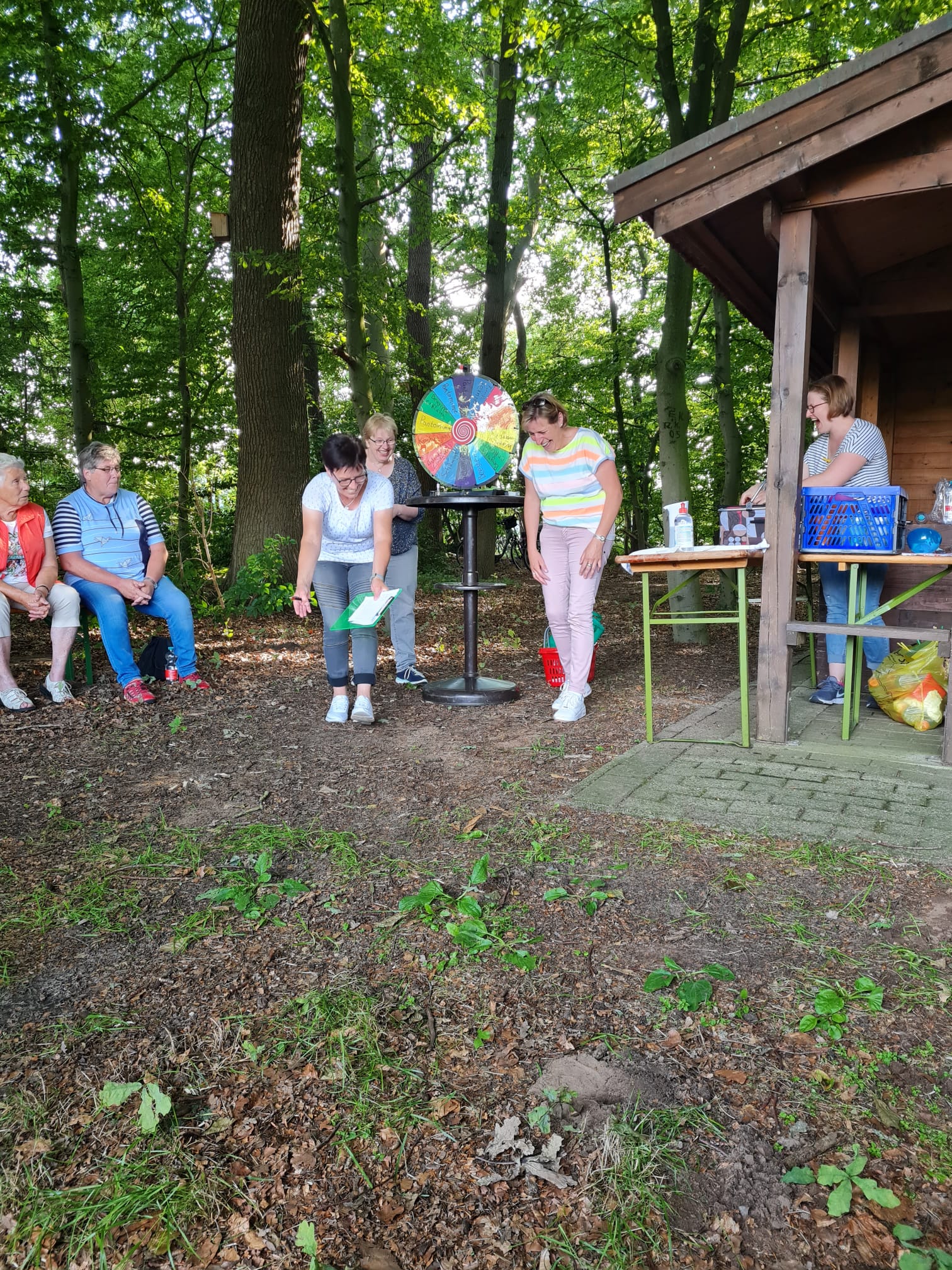Am Montag, den 26. Juli 2021 machten sich 60 Frauen der kfd Beesten mit dem Fahrrad auf den Weg zur Hüttentour rund um Beesten. Gestartet wurde bei bestem Wetter am Michaelhaus. Die erste Station war die Honer Hütte, gebaut 2005 vom Fastabend Hone. Nach einer kleinen Erfrischung ging es weiter zum Hof Duisen, hier gab es für alle Kaffee und Kuchen. An dieser Stelle begann dann das Hütten-Glücksrad-Spiel (vorbereitet von M. Schröder und A. Jürling). Die Frauen wurden in fünf Gruppen eingeteilt und durften das Glücksrad drehen. Es folgten dann Quiz-Fragen aus verschiedenen Kategorien (z.B. Märchen, Wann war´s, kfd Beesten, Dorf Beesten, Schlager usw.) oder Pantomime oder Begriffe erklären. Die Frauen hatten dabei viel Spaß und spielten für ihre Gruppe um den Sieg beim Hütten-Glücksrad. Anschließend ging es mit dem Rad weiter zur Stroothooker Hütte, gebaut 2006 vom Fastabend Stroothook. Auch hier wurde das Glücksrad gedreht, bevor es weiterging zur nächsten Hütte, dem Meschker Schott, gebaut 1992 vom Heimatverein Beesten. An dieser Hütte gab es für alle das Erfrischungsgetränk „Sanfter Engel“. Frisch gestärkt ging es weiter zum Talger Eck, gebaut 1997 vom Fastabend Talge 2. Nachdem das Glücksrad gedreht war, fuhren die Frauen zur letzten Station, der Wilster Hütte. Sie wurde 1985 gebaut und 2005 renoviert vom Fastabend Wilsten. Zum Abschluss ging es dann wieder zum Michaelhaus. Hier erwartete die Frauen ein Grillbuffet im Pfarrgarten vom Partyservice Lüns aus Freren. Nachdem die Siegergruppe des Glücksrad-Quiz mit einem kleinen Preis geehrt wurde, neigte sich der Ausflug langsam dem Ende entgegen.