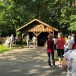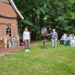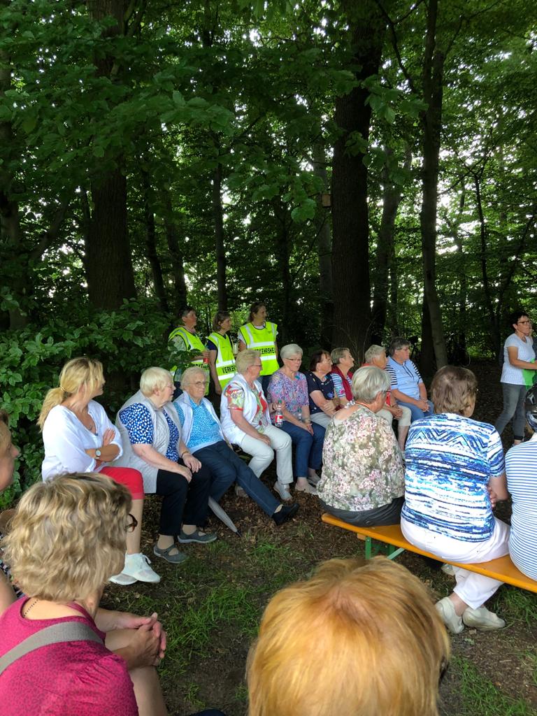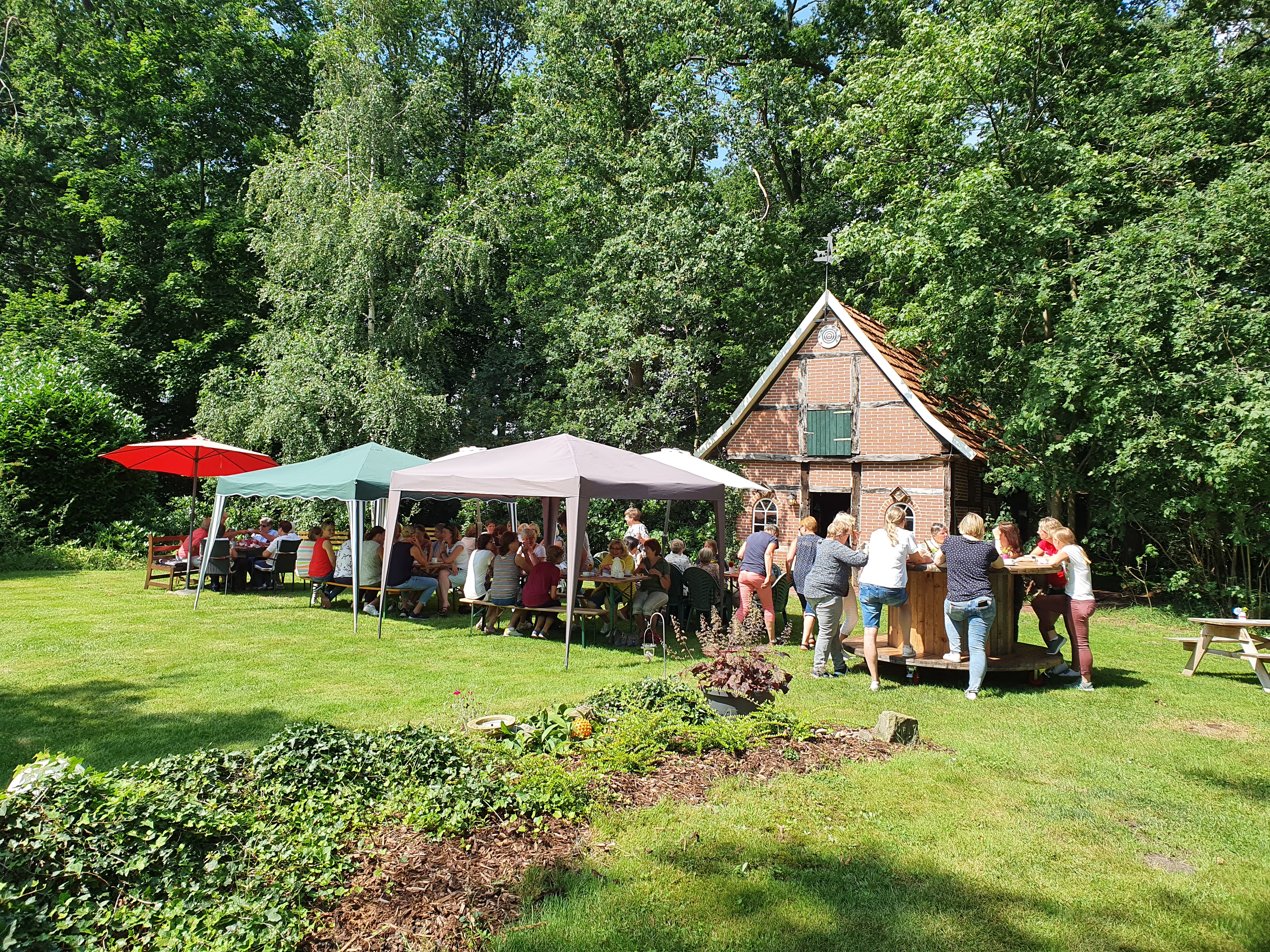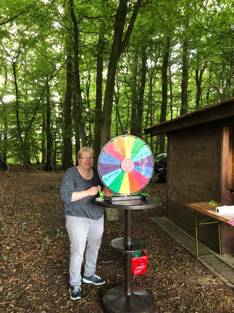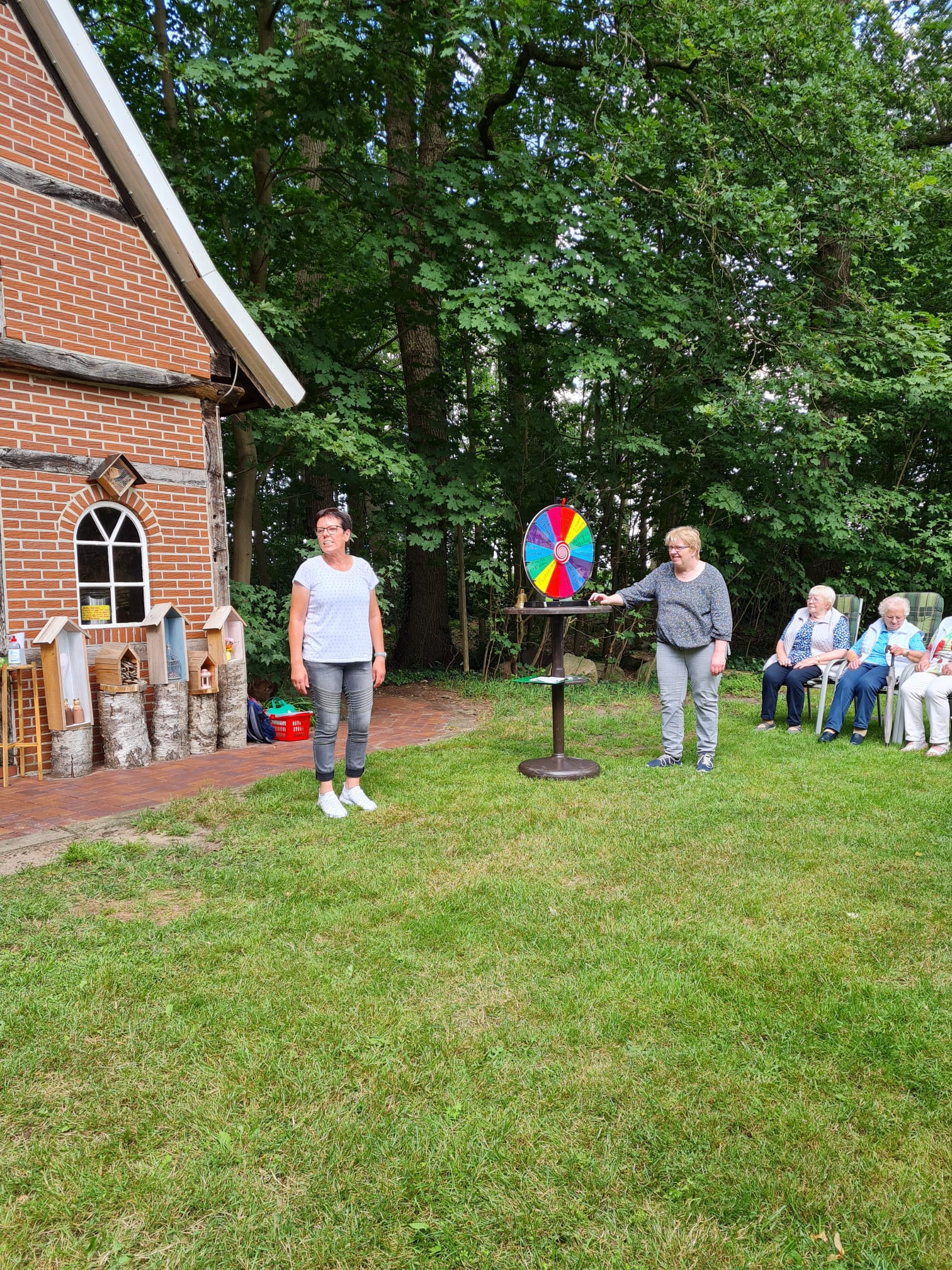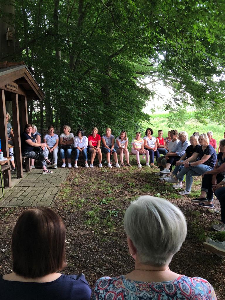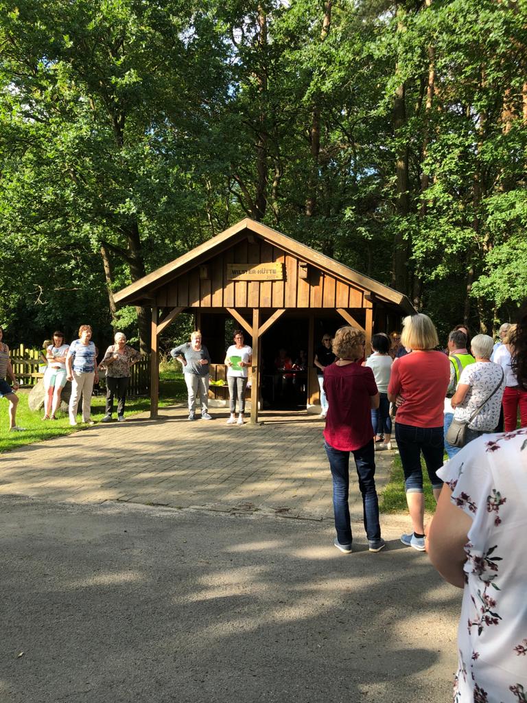 Am Montag, den 26. Juli 2021 machten sich 60 Frauen der kfd Beesten mit dem Fahrrad auf den Weg zur Hüttentour rund um Beesten. Gestartet wurde bei bestem Wetter am Michaelhaus. Die erste Station war die Honer Hütte, gebaut 2005 vom Fastabend Hone. Nach einer kleinen Erfrischung ging es weiter zum Hof Duisen, hier gab es für alle Kaffee und Kuchen. An dieser Stelle begann dann das Hütten-Glücksrad-Spiel (vorbereitet von M. Schröder und A. Jürling). Die Frauen wurden in fünf Gruppen eingeteilt und durften das Glücksrad drehen. Es folgten dann Quiz-Fragen aus verschiedenen Kategorien (z.B. Märchen, Wann war´s, kfd Beesten, Dorf Beesten, Schlager usw.) oder Pantomime oder Begriffe erklären. Die Frauen hatten dabei viel Spaß und spielten für ihre Gruppe um den Sieg beim Hütten-Glücksrad. Anschließend ging es mit dem Rad weiter zur Stroothooker Hütte, gebaut 2006 vom Fastabend Stroothook. Auch hier wurde das Glücksrad gedreht, bevor es weiterging zur nächsten Hütte, dem Meschker Schott, gebaut 1992 vom Heimatverein Beesten. An dieser Hütte gab es für alle das Erfrischungsgetränk „Sanfter Engel“. Frisch gestärkt ging es weiter zum Talger Eck, gebaut 1997 vom Fastabend Talge 2. Nachdem das Glücksrad gedreht war, fuhren die Frauen zur letzten Station, der Wilster Hütte. Sie wurde 1985 gebaut und 2005 renoviert vom Fastabend Wilsten. Zum Abschluss ging es dann wieder zum Michaelhaus. Hier erwartete die Frauen ein Grillbuffet im Pfarrgarten vom Partyservice Lüns aus Freren. Nachdem die Siegergruppe des Glücksrad-Quiz mit einem kleinen Preis geehrt wurde, neigte sich der Ausflug langsam dem Ende entgegen.