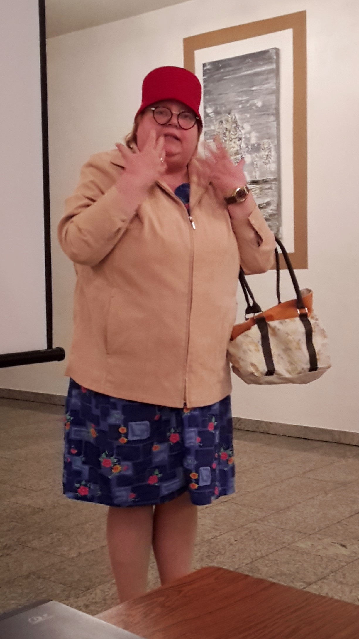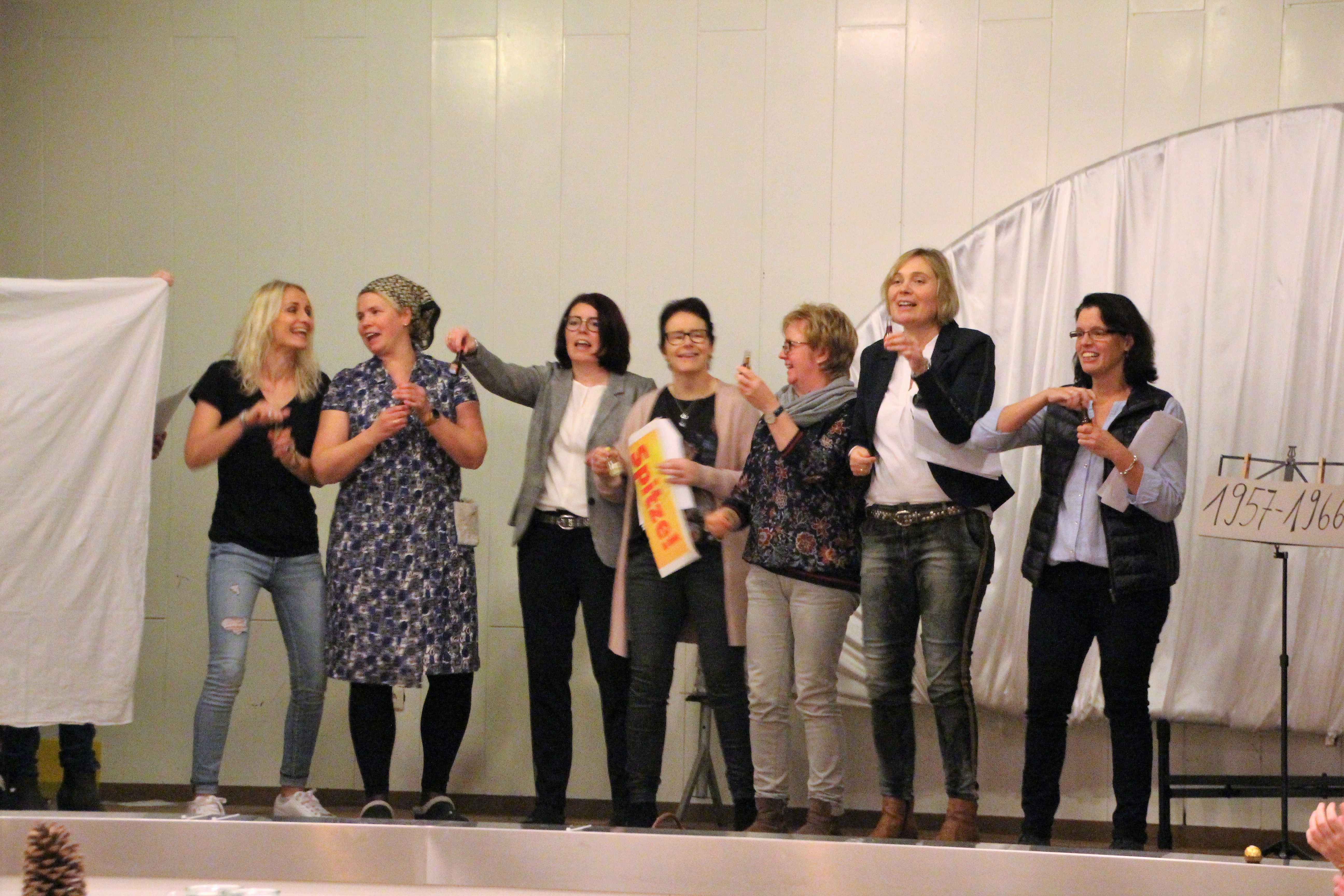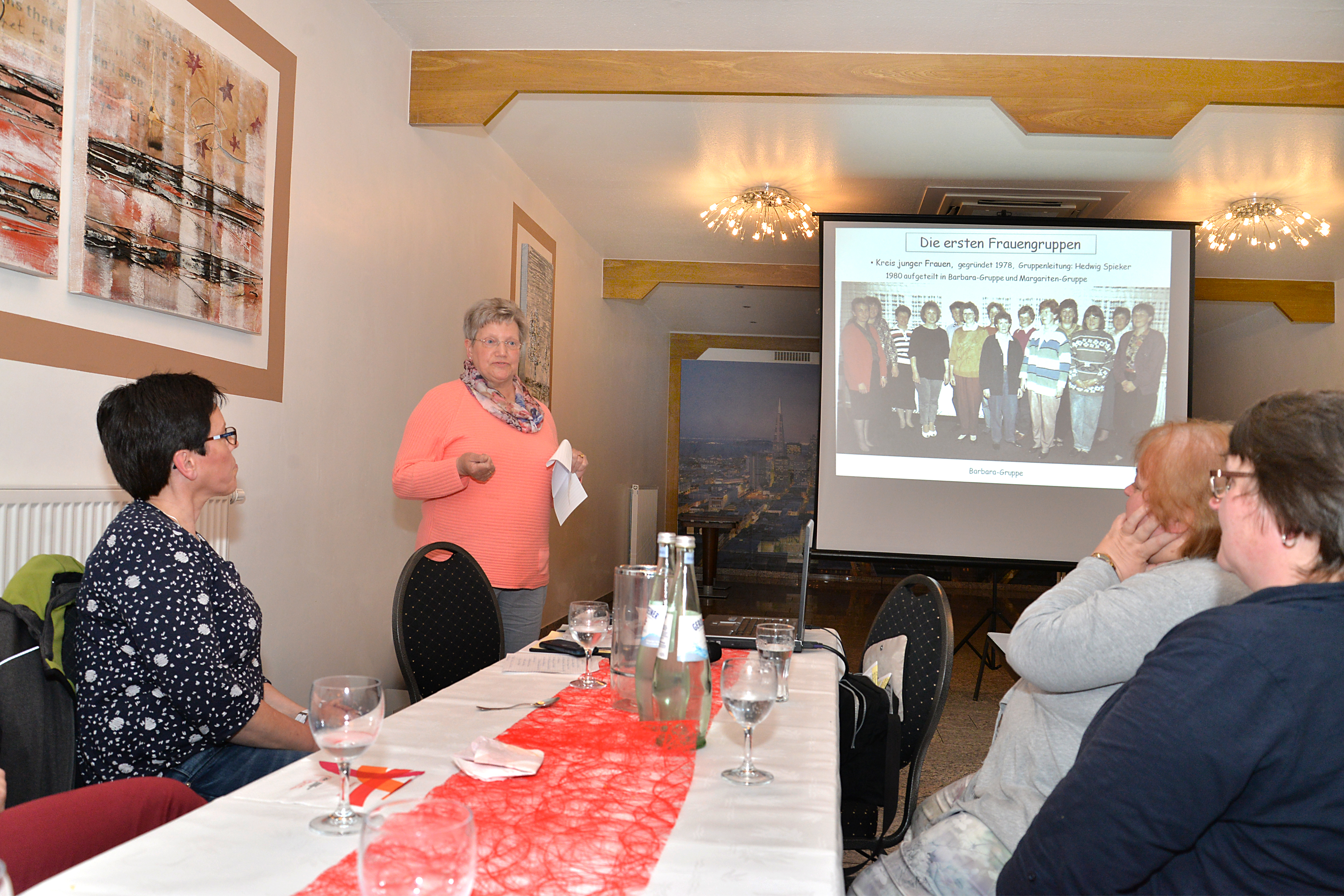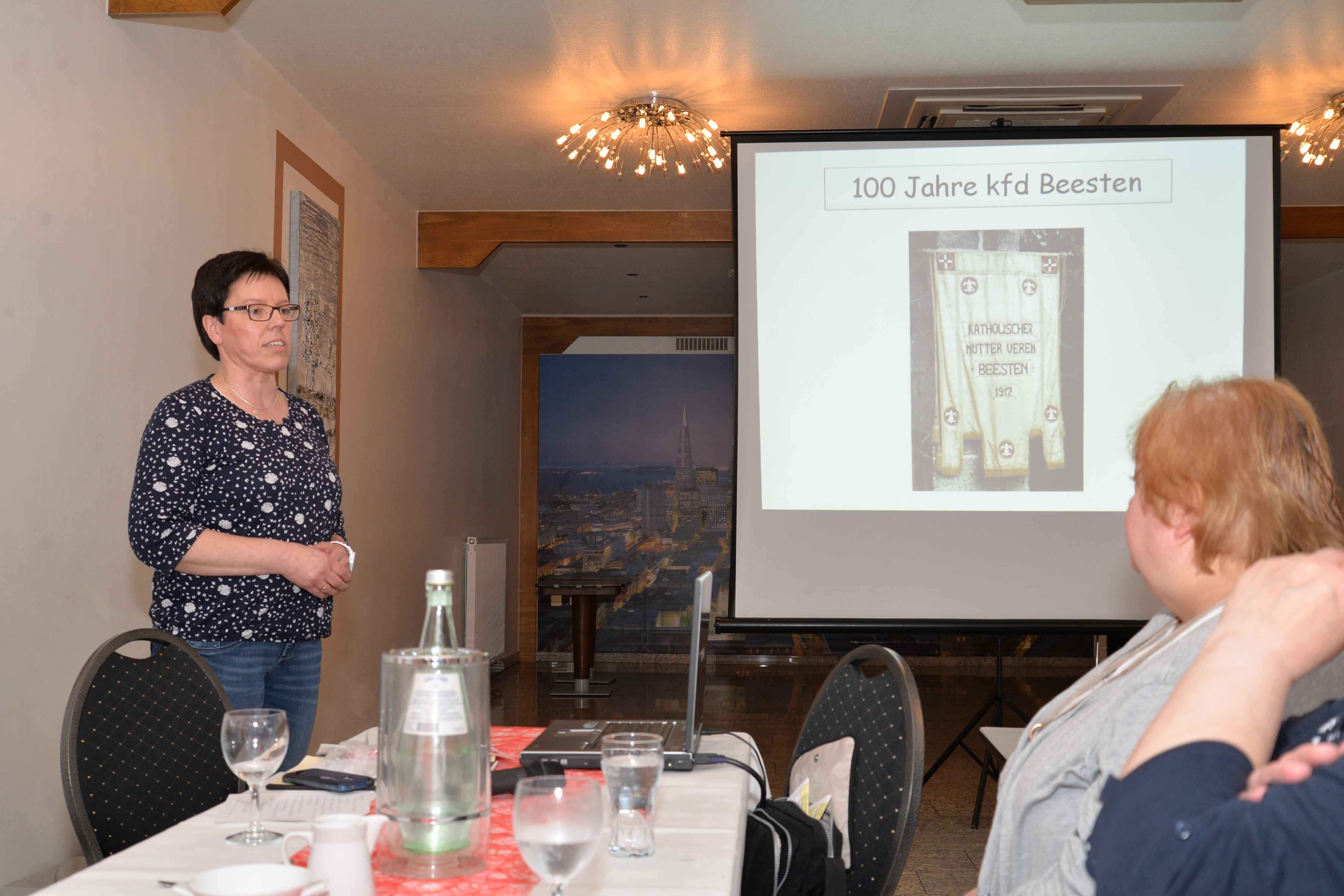 Annegret Jürling, Teamsprecherin des kfd-Leitungsteams, gab anhand einer Foto-Präsentation einen Einblick in die 100jährige Geschichte der kfd Beesten. Viele der anwesenden Frauen fanden sich darin wieder und konnten noch interessante Details dazu erzählen. Die ehemaligen ersten Vorsitzenden Hedwig Spieker und Gertrud Griep steuerten noch bemerkenswerte und lustige Geschichten aus ihrer Amtszeit bei, so dass es ein unterhaltsamer Ausflug in die Vergangenheit wurde. Aufgelockert wurde der Nachmittag noch durch die kfd-Mitglieder Helga Brüggemeier und Hildegard Börjes, die einen Sketch und einen Comedy-Auftritt (Helga als Änne von Dröpplingen) darboten. Zum Abschluss erhielt jede Frau noch als Geschenk eine Chronik der kfd Beesten, einen Gebetszettel und einen kfd-Kugelschreiber.