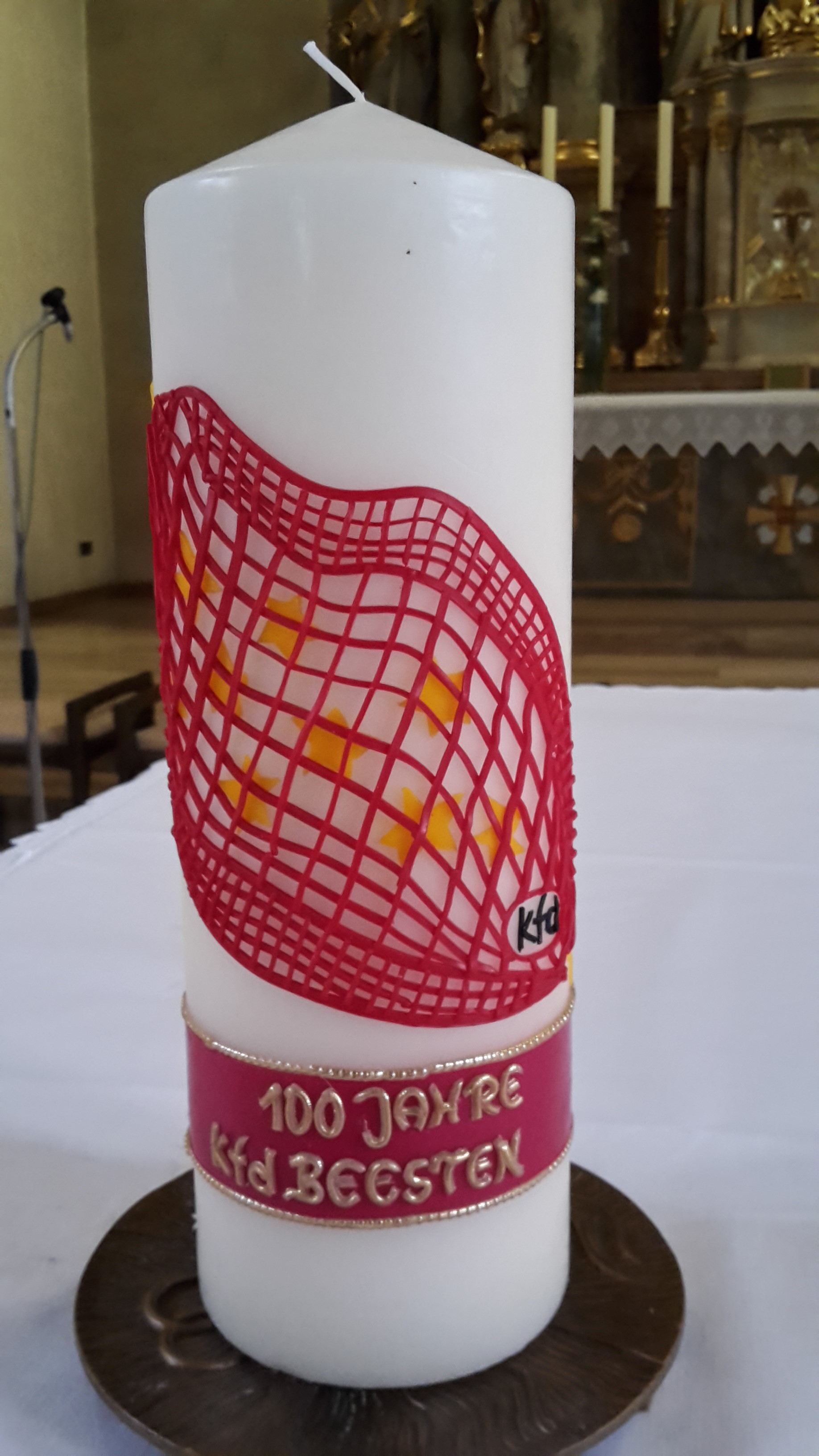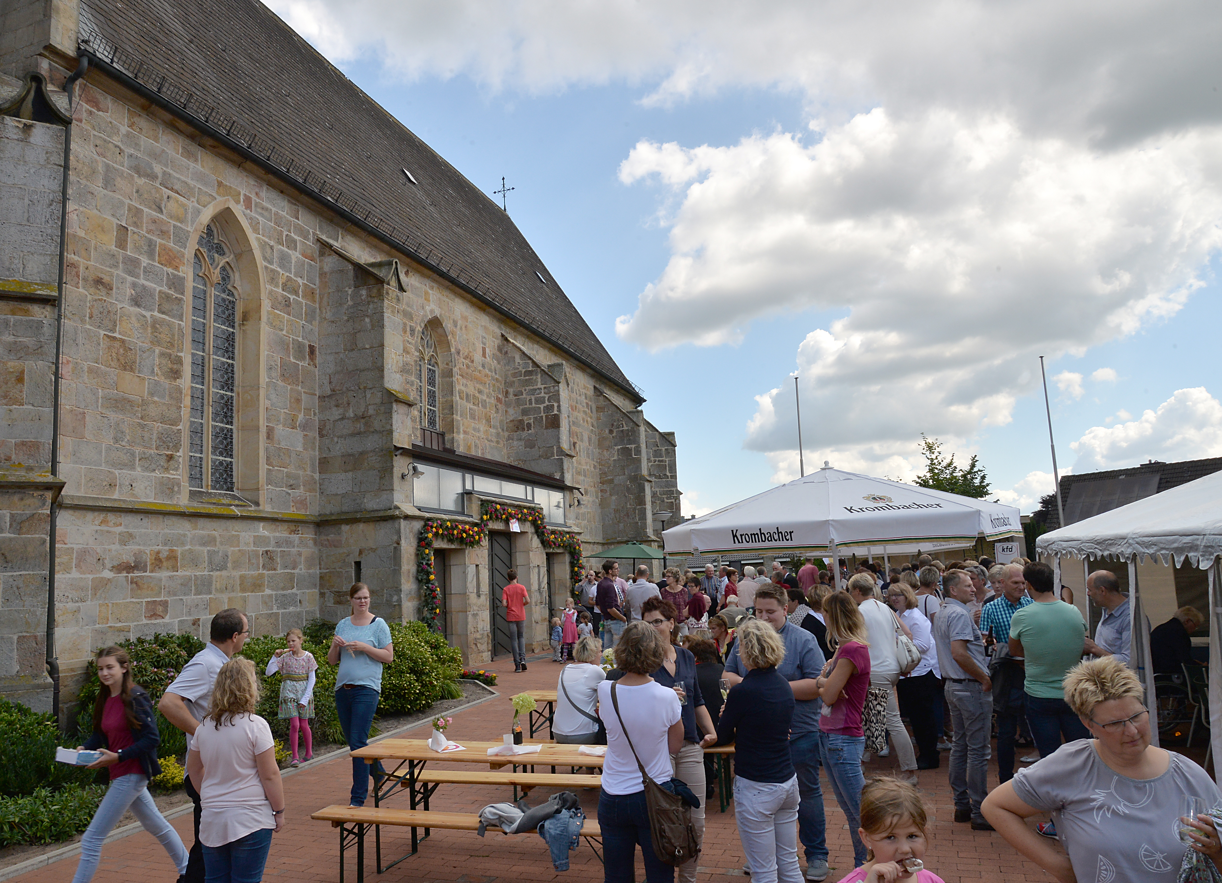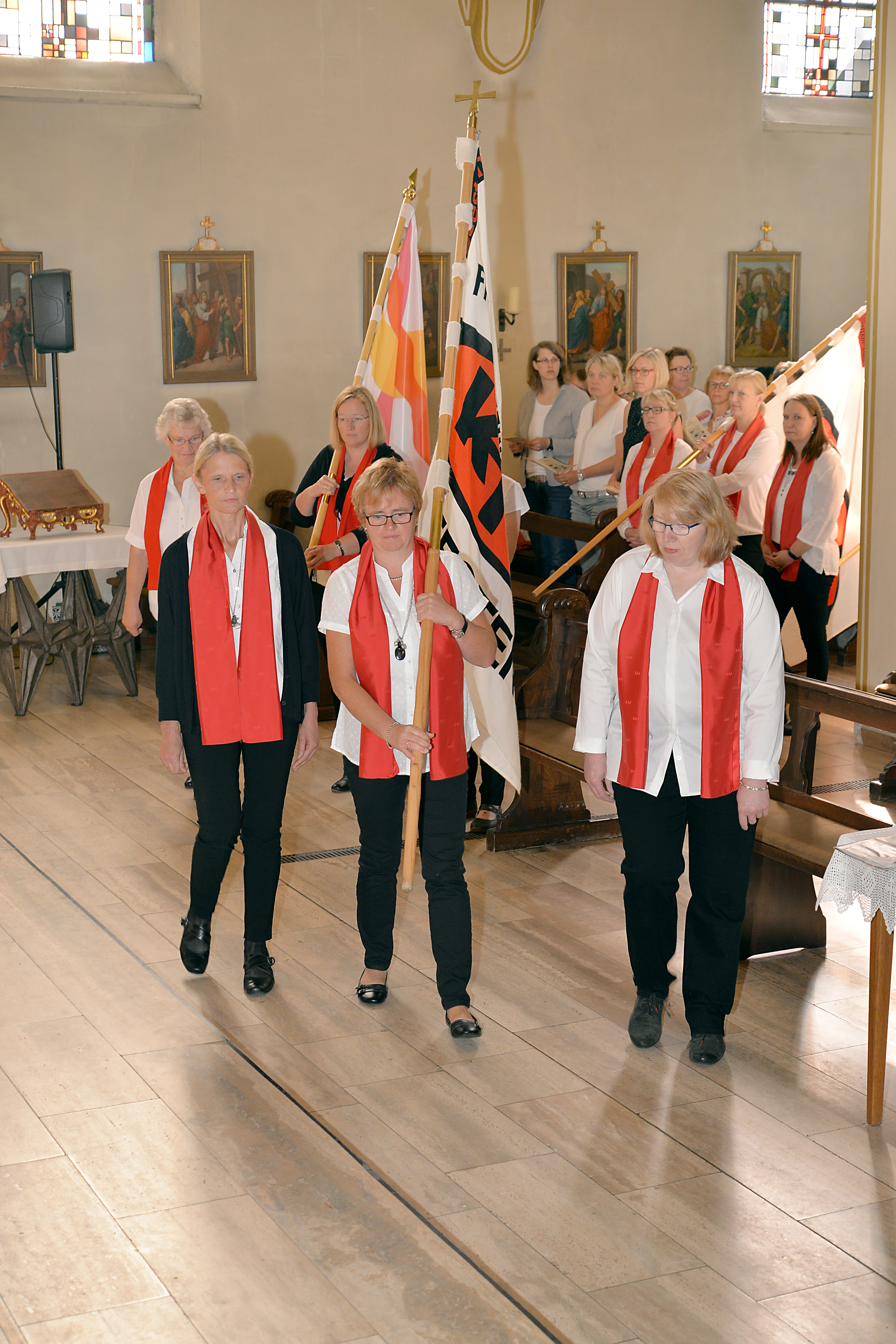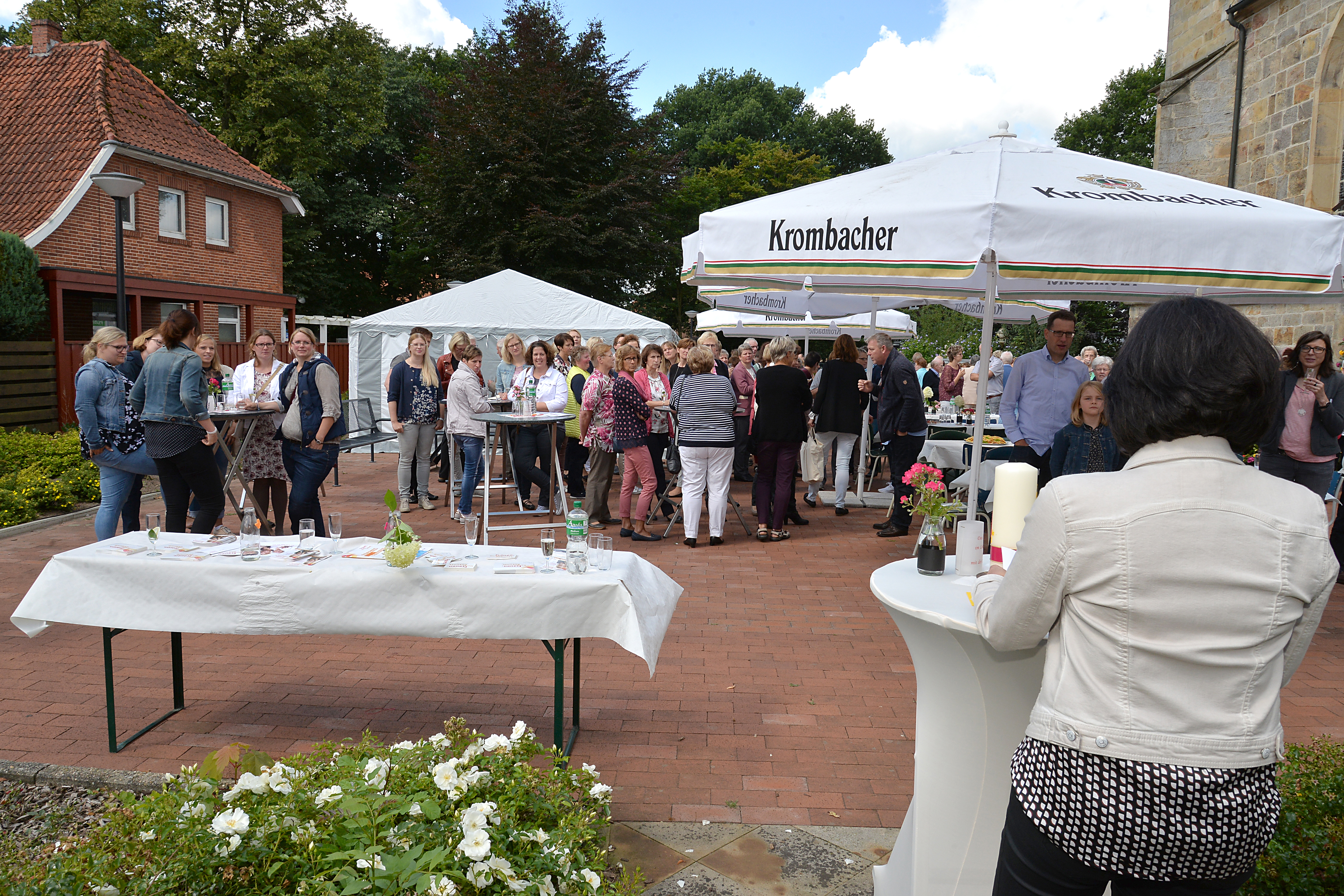 „Häng dich rein ins Netz, das Frauen trägt“ – unter diesem Motto feierte die kfd Beesten am 6. August 2017 den Festgottesdienst im Rahmen der Jubiläumsfeier zum 100jährigen Bestehen. Als Symbol für die starke Gemeinschaft, trugen acht Vertreter der einzelnen kfd-Frauengruppen ein großes rotes Netz in die Kirche, in das persönlich gestaltete Sterne der kfd-Mitglieder eingebunden waren. Auch dank des Musikteams und der Mitwirkung aller Frauengruppen war es ein feierlicher und stimmungsvoller Festgottesdienst. Die Dekanatssprecherin Walburga Langeborg, Bürgermeister Werner Achteresch und Pastor Jürgen Krallmann richteten noch einige Grußworte an die Festgäste, bevor es zum Empfang auf den Kirchvorplatz ging. Bei strahlendem Sonnenschein wurde rund um den Kirchturm das Jubiläum gefeiert. Die ganze Gemeinde und alle Festgäste waren eingeladen. Für das leibliche Wohl war gesorgt und auch die Kinder hatten ihren Spaß beim Karussell fahren und beim Luftballonwettbewerb. Es war ein fröhliches und lebendiges Miteinander. Maria Teepker vom Regionalverband und der Kolpingvorsitzende Johannes Brinker, als Vertreter der Beestener Vereine, übermittelten ihre Glückwünsche zum Jubiläum und unterstrichen noch einmal die Wichtigkeit der kfd für die Gemeinde. Auch an diesem Festtag wurde deutlich, dass die kfd Beesten fest in das Gemeindeleben eingebunden ist.