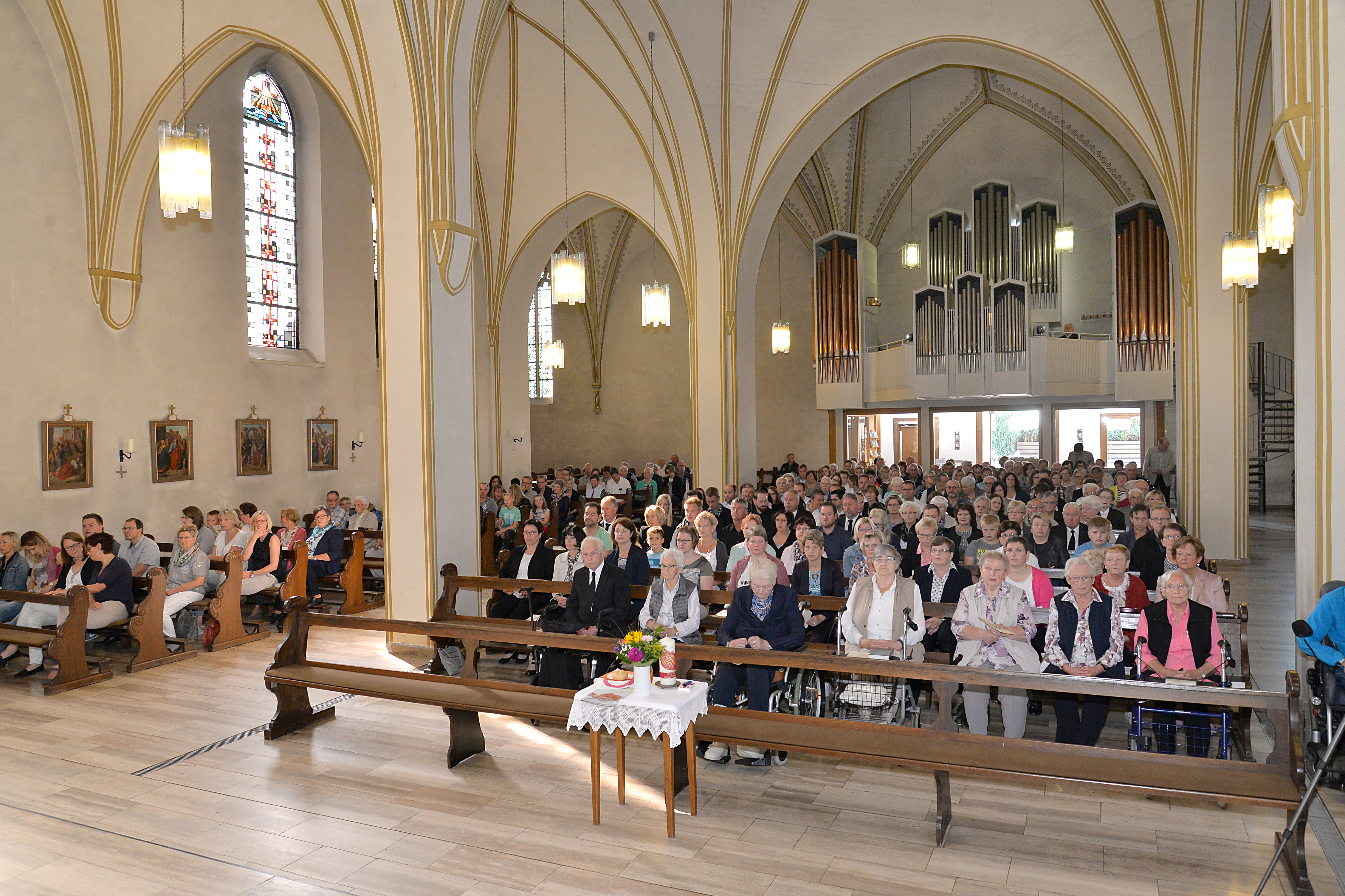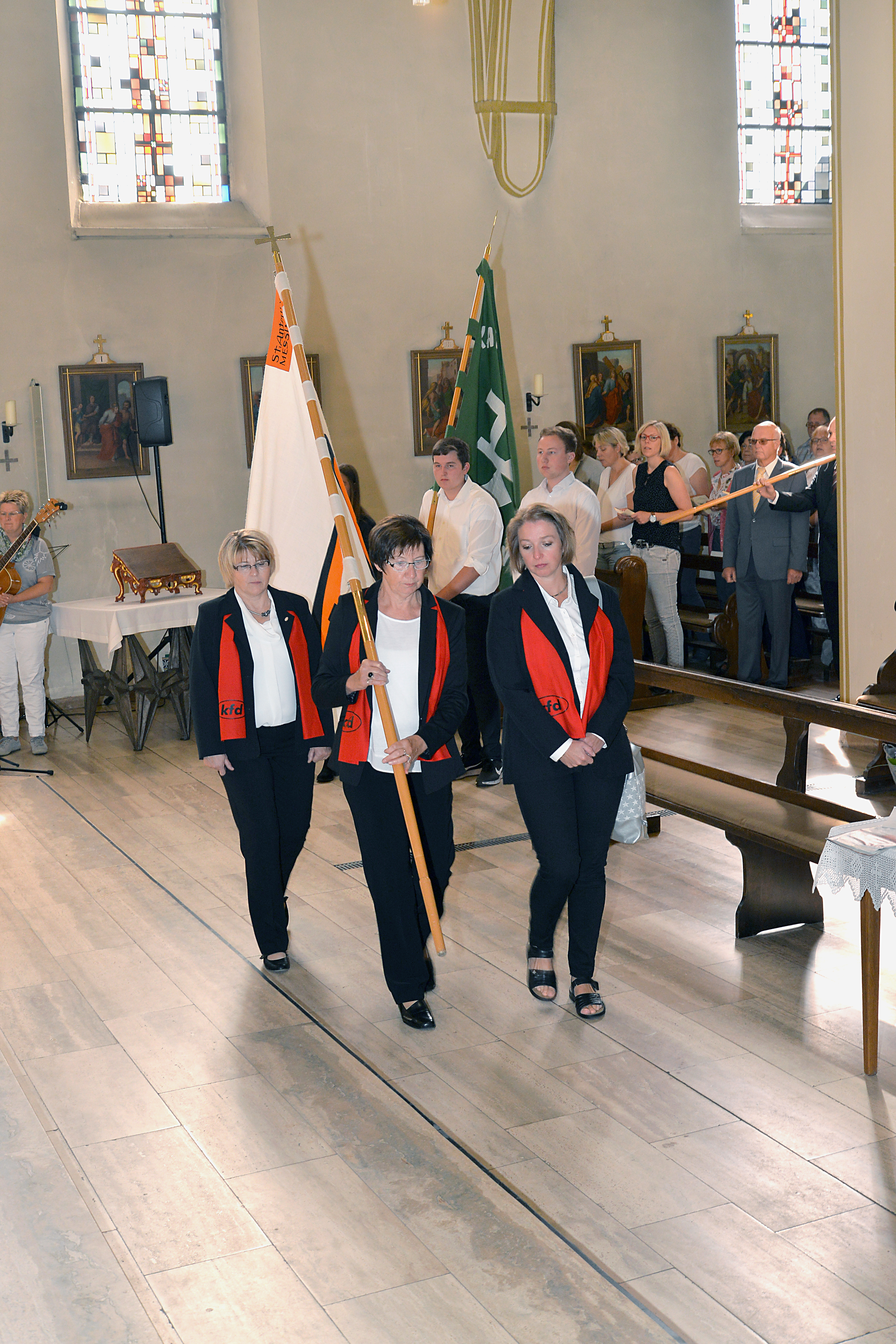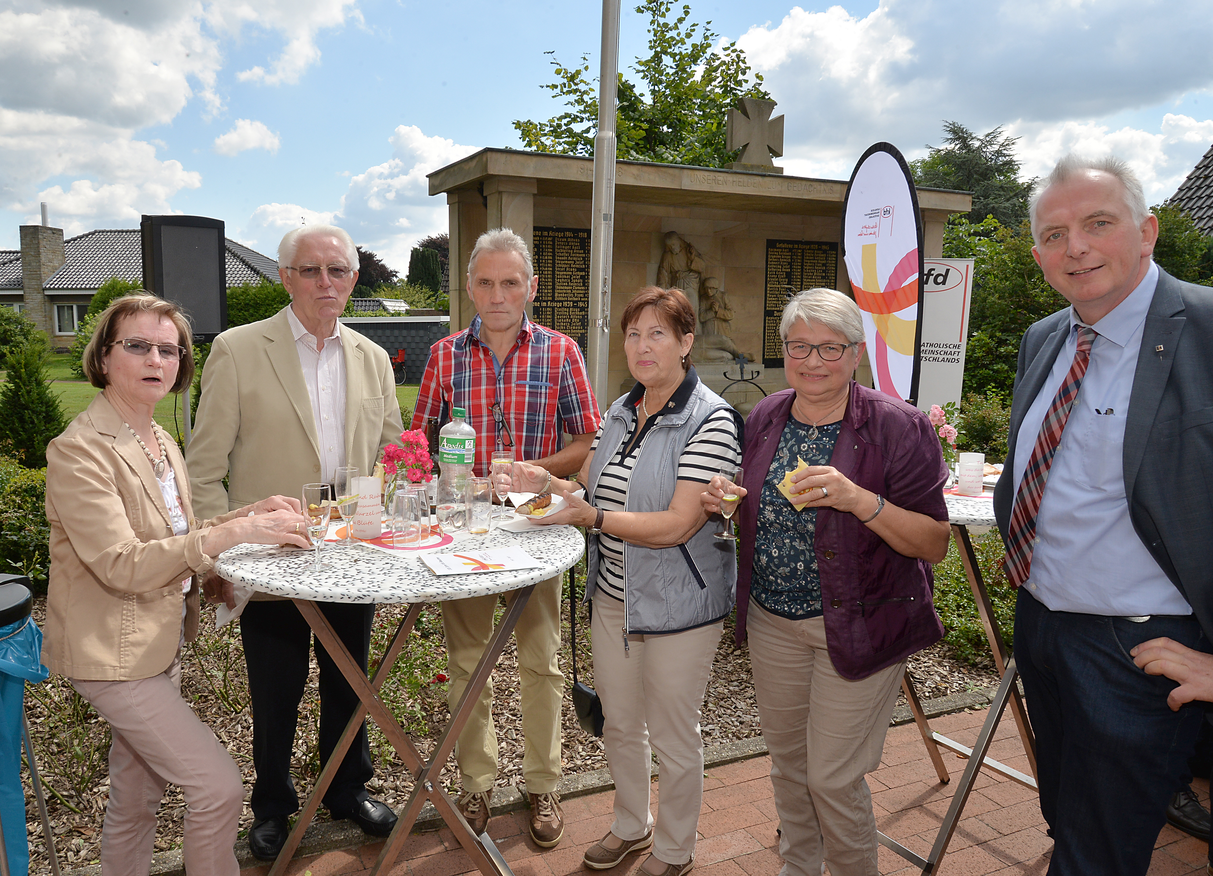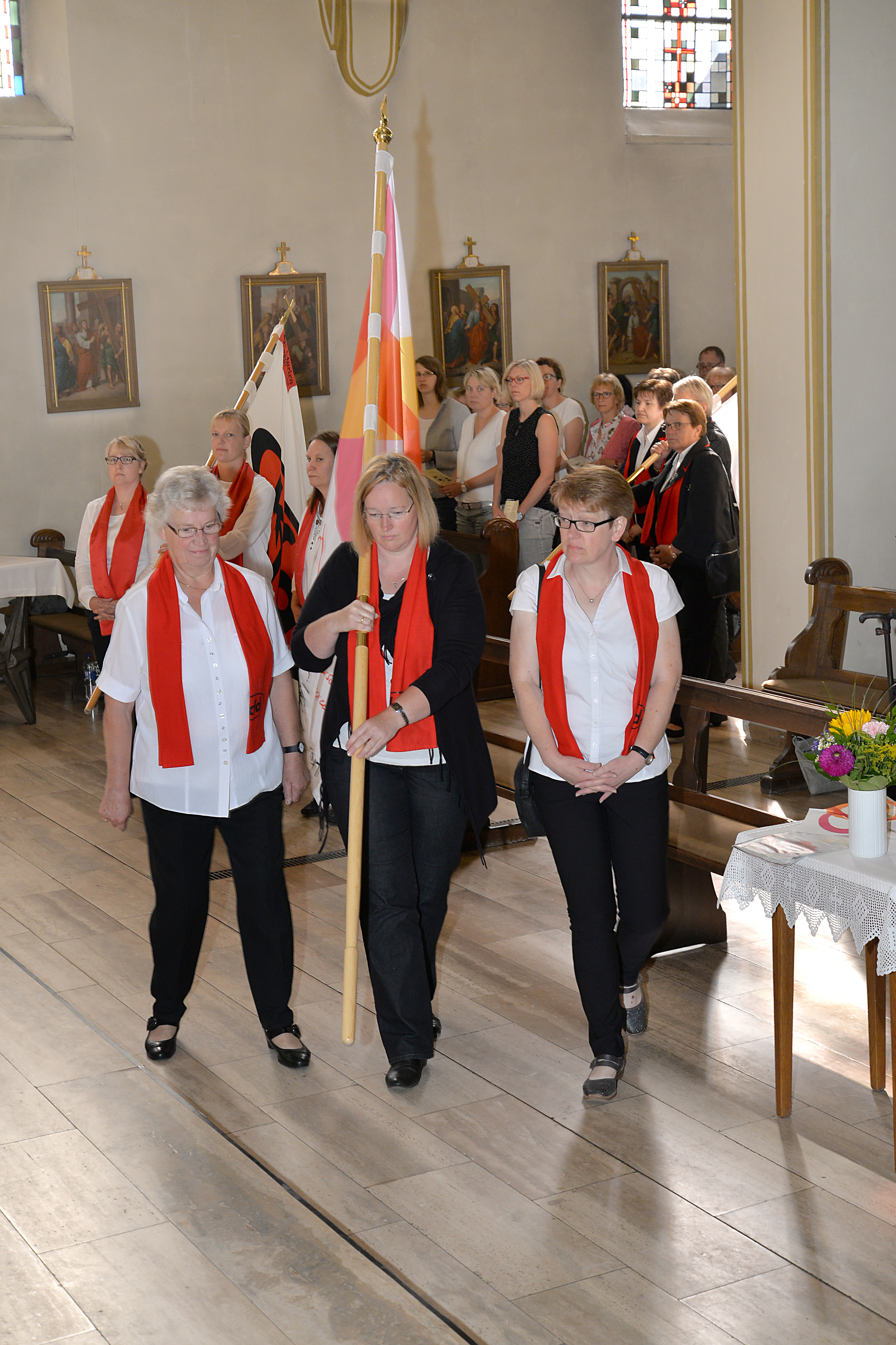 „Häng dich rein ins Netz, das Frauen trägt“ – unter diesem Motto feierte die kfd Beesten am 6. August 2017 den Festgottesdienst im Rahmen der Jubiläumsfeier zum 100jährigen Bestehen. Als Symbol für die starke Gemeinschaft, trugen acht Vertreter der einzelnen kfd-Frauengruppen ein großes rotes Netz in die Kirche, in das persönlich gestaltete Sterne der kfd-Mitglieder eingebunden waren. Auch dank des Musikteams und der Mitwirkung aller Frauengruppen war es ein feierlicher und stimmungsvoller Festgottesdienst. Die Dekanatssprecherin Walburga Langeborg, Bürgermeister Werner Achteresch und Pastor Jürgen Krallmann richteten noch einige Grußworte an die Festgäste, bevor es zum Empfang auf den Kirchvorplatz ging. Bei strahlendem Sonnenschein wurde rund um den Kirchturm das Jubiläum gefeiert. Die ganze Gemeinde und alle Festgäste waren eingeladen. Für das leibliche Wohl war gesorgt und auch die Kinder hatten ihren Spaß beim Karussell fahren und beim Luftballonwettbewerb. Es war ein fröhliches und lebendiges Miteinander. Maria Teepker vom Regionalverband und der Kolpingvorsitzende Johannes Brinker, als Vertreter der Beestener Vereine, übermittelten ihre Glückwünsche zum Jubiläum und unterstrichen noch einmal die Wichtigkeit der kfd für die Gemeinde. Auch an diesem Festtag wurde deutlich, dass die kfd Beesten fest in das Gemeindeleben eingebunden ist.