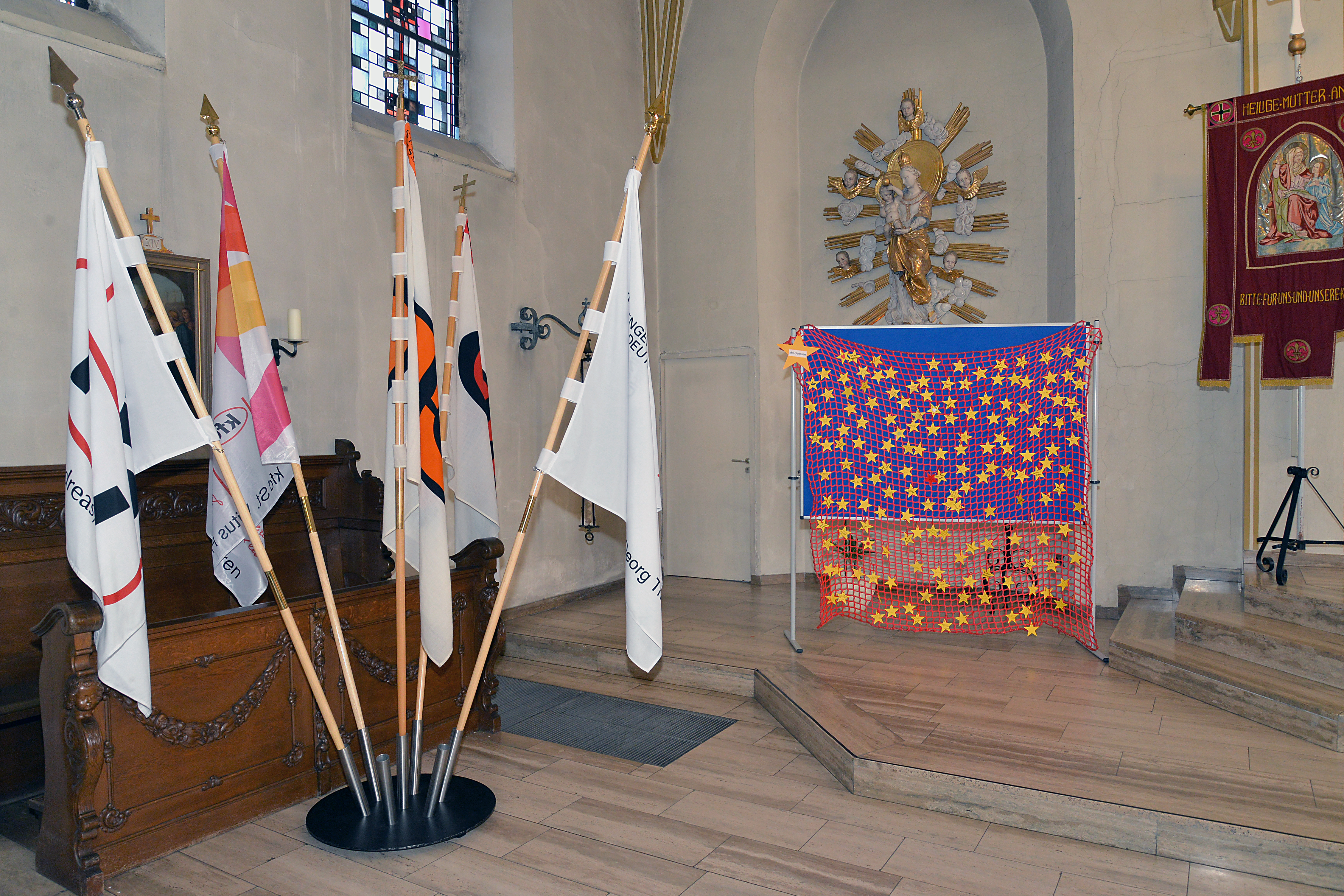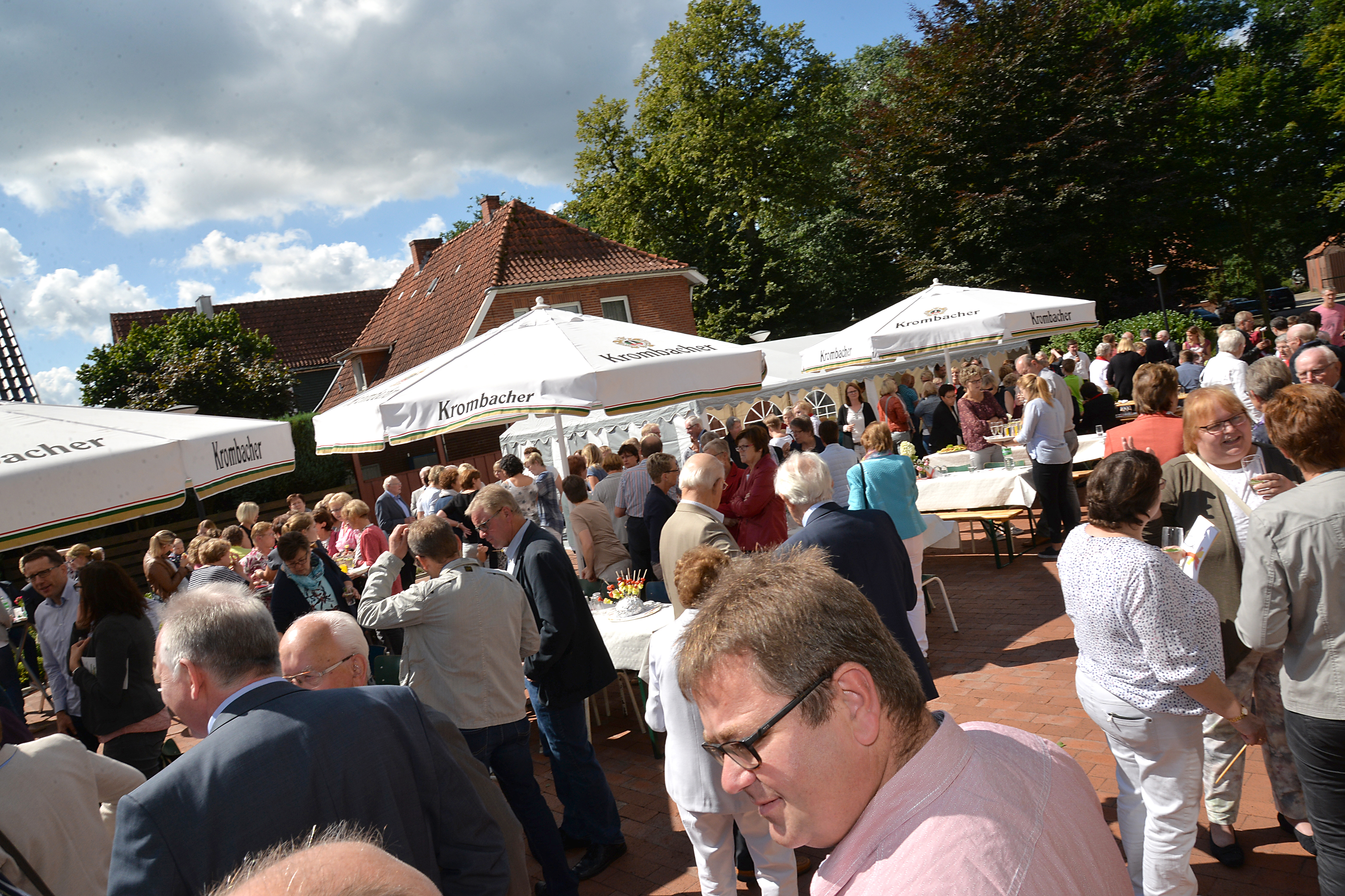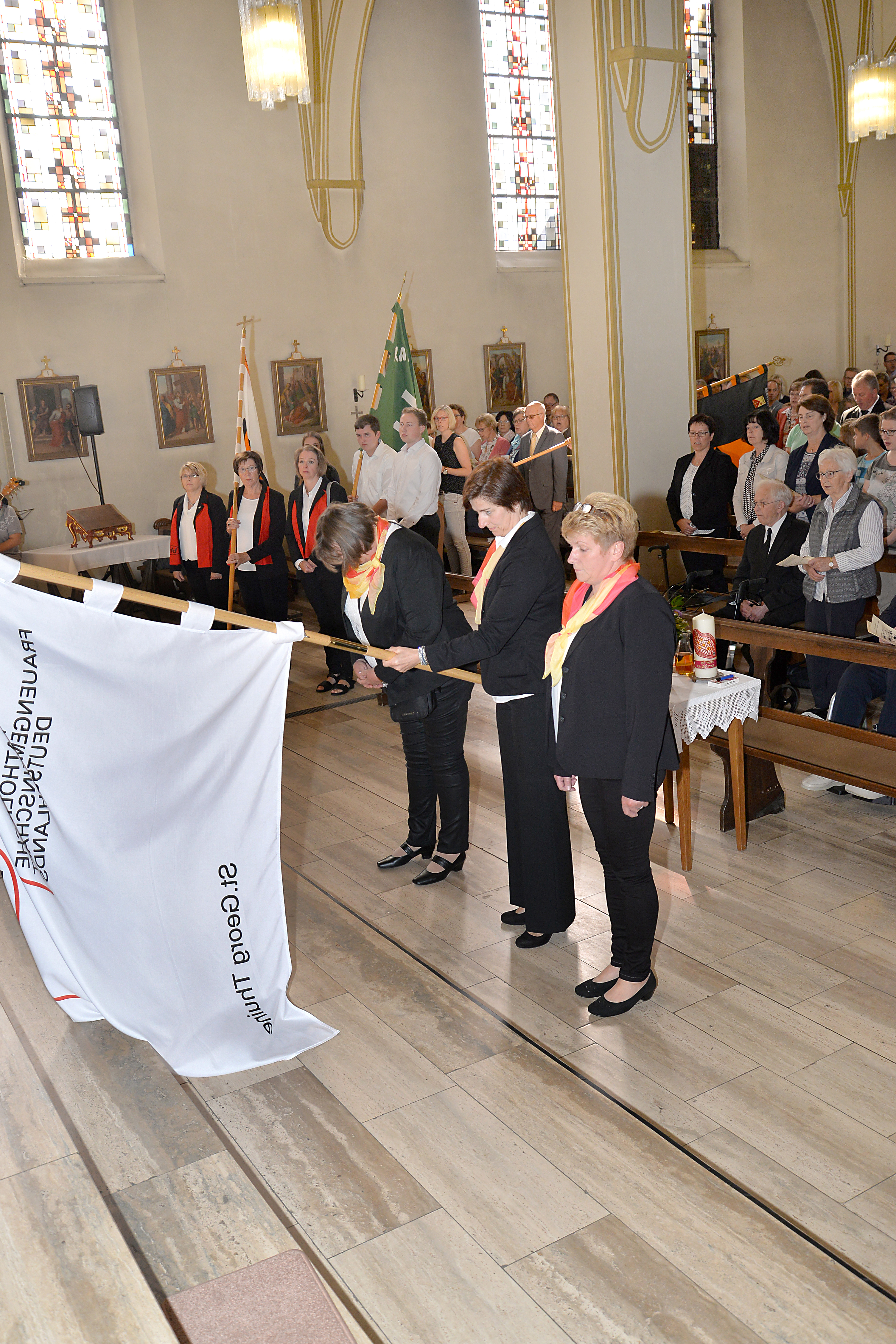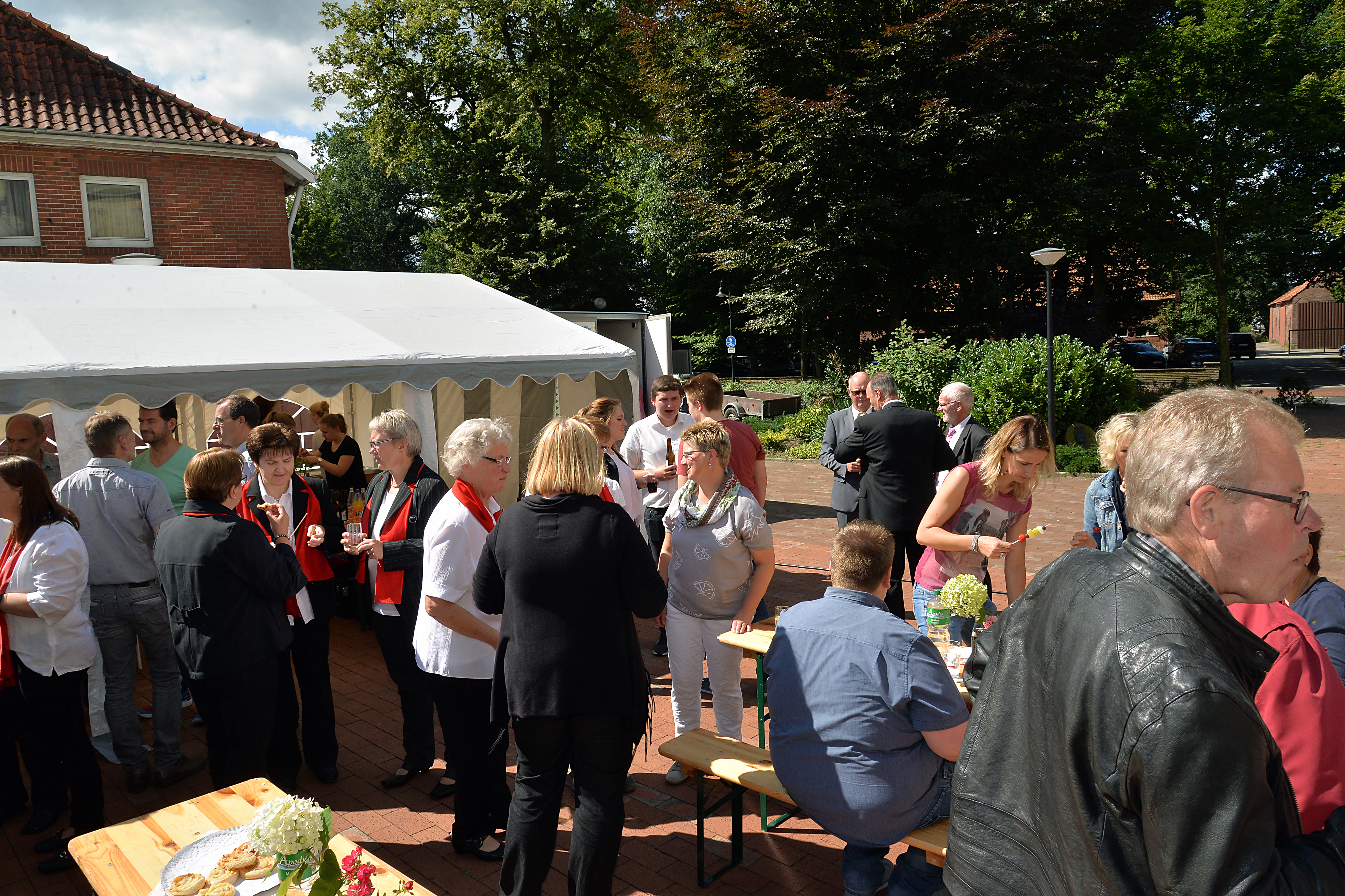 „Häng dich rein ins Netz, das Frauen trägt“ – unter diesem Motto feierte die kfd Beesten am 6. August 2017 den Festgottesdienst im Rahmen der Jubiläumsfeier zum 100jährigen Bestehen. Als Symbol für die starke Gemeinschaft, trugen acht Vertreter der einzelnen kfd-Frauengruppen ein großes rotes Netz in die Kirche, in das persönlich gestaltete Sterne der kfd-Mitglieder eingebunden waren. Auch dank des Musikteams und der Mitwirkung aller Frauengruppen war es ein feierlicher und stimmungsvoller Festgottesdienst. Die Dekanatssprecherin Walburga Langeborg, Bürgermeister Werner Achteresch und Pastor Jürgen Krallmann richteten noch einige Grußworte an die Festgäste, bevor es zum Empfang auf den Kirchvorplatz ging. Bei strahlendem Sonnenschein wurde rund um den Kirchturm das Jubiläum gefeiert. Die ganze Gemeinde und alle Festgäste waren eingeladen. Für das leibliche Wohl war gesorgt und auch die Kinder hatten ihren Spaß beim Karussell fahren und beim Luftballonwettbewerb. Es war ein fröhliches und lebendiges Miteinander. Maria Teepker vom Regionalverband und der Kolpingvorsitzende Johannes Brinker, als Vertreter der Beestener Vereine, übermittelten ihre Glückwünsche zum Jubiläum und unterstrichen noch einmal die Wichtigkeit der kfd für die Gemeinde. Auch an diesem Festtag wurde deutlich, dass die kfd Beesten fest in das Gemeindeleben eingebunden ist.