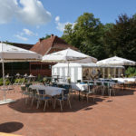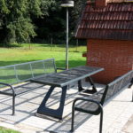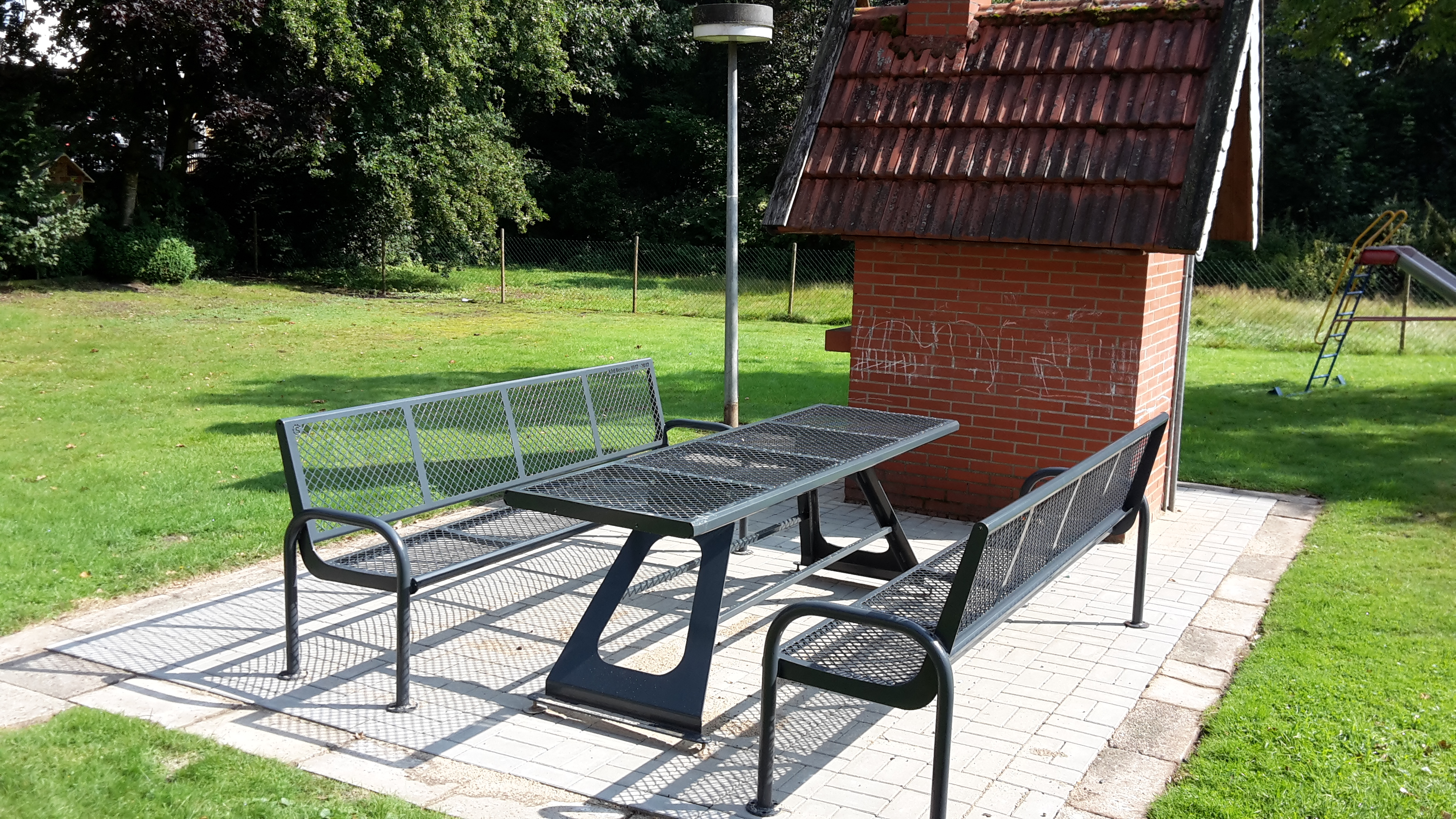 Die Sitzgruppe, angefertigt durch die Firma Schüring, steht hinter dem Michaelhaus beim Steinofen.