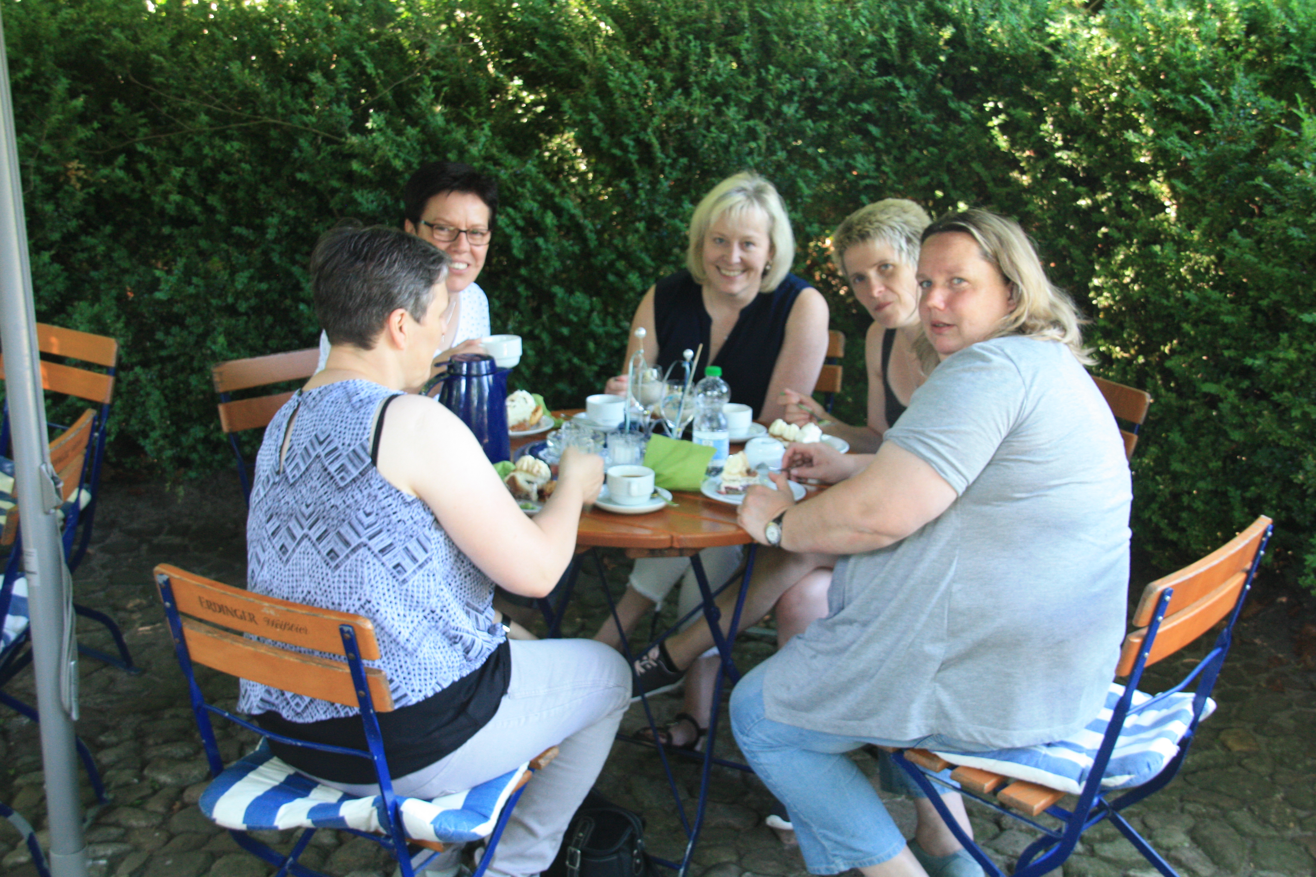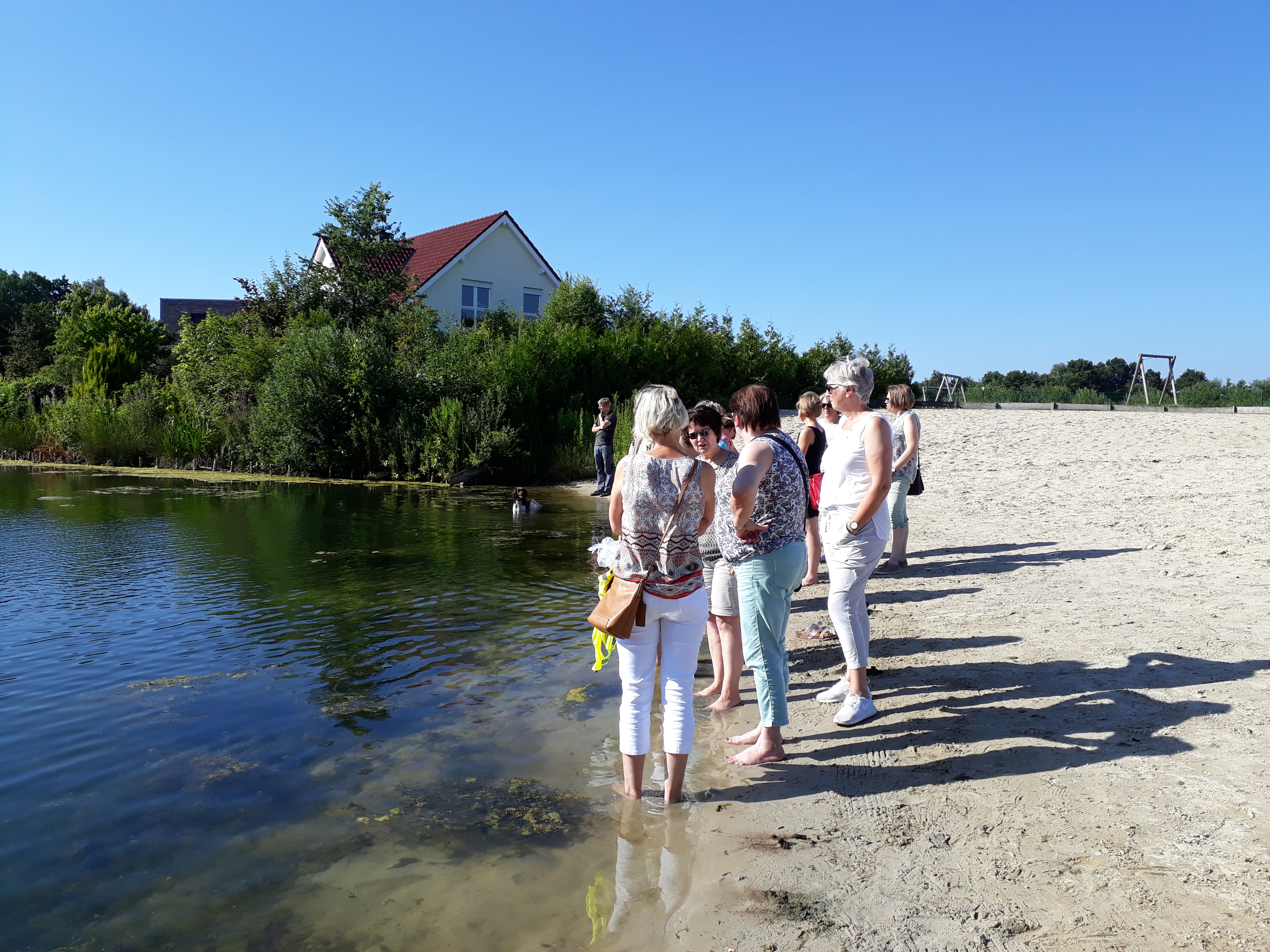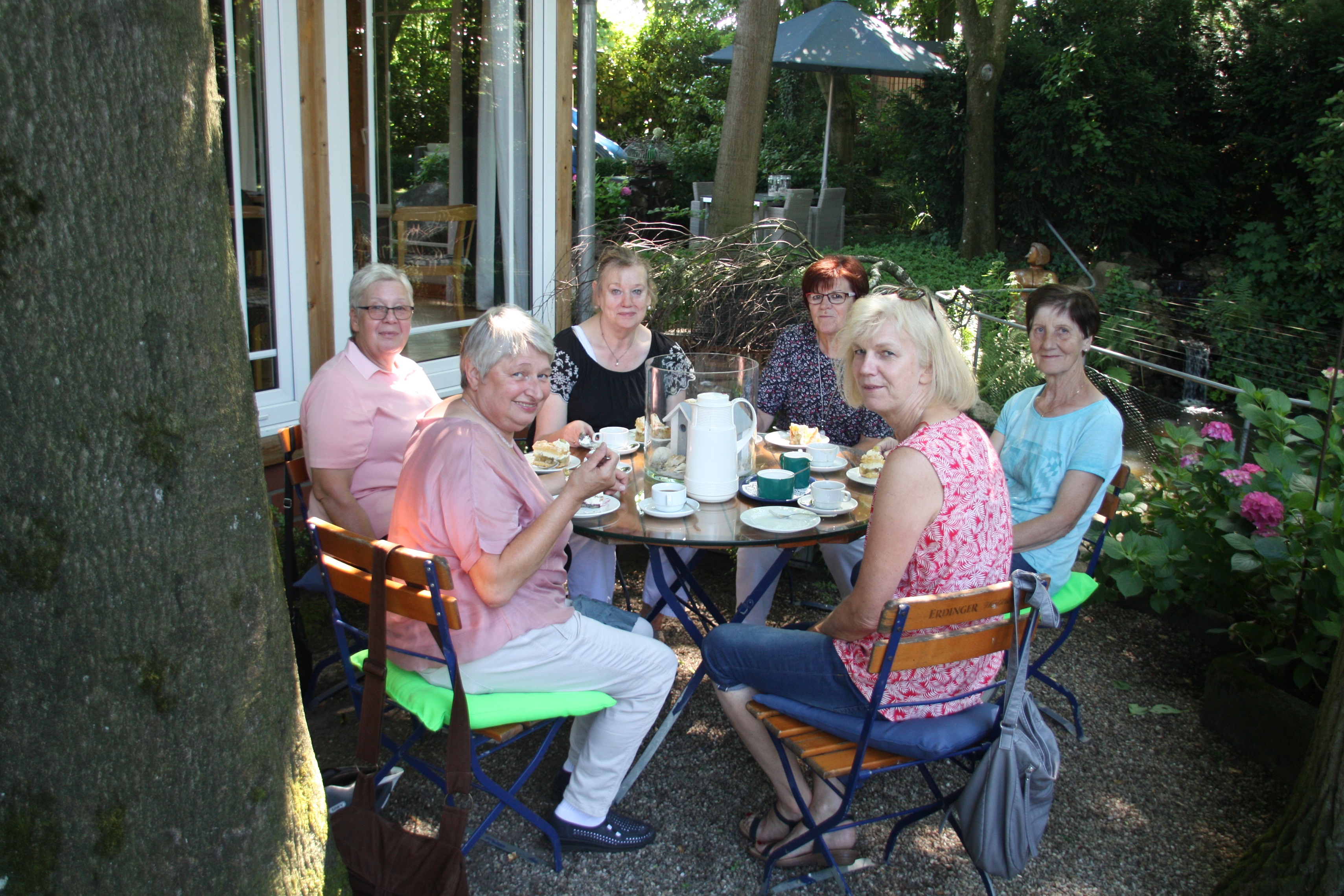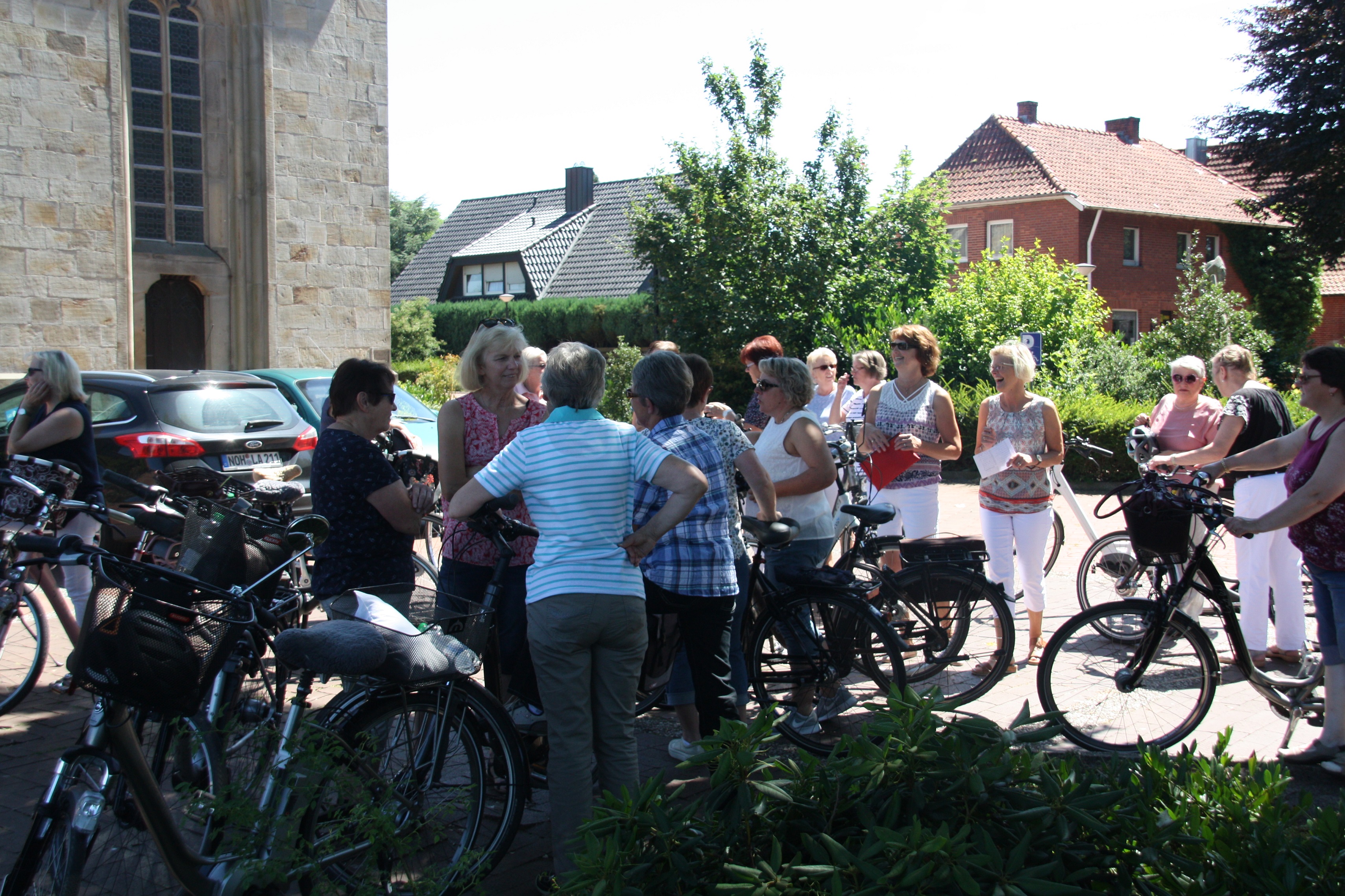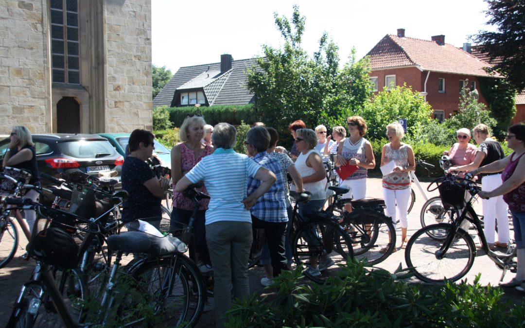 Am Freitag, den 29. Juni 2018 trafen sich 59 Frauen zur kfd-Fahrradtour. Los ging es bei herrlichem Sonnenschein Richtung Wilsten. An der Wilster Hütte konnten sich die Frauen bei kühlen Getränken erfrischen, bevor es weiterging Richtung Lünne. Im wunderschönen Biergarten der Gaststätte Helming in Lünne gab es in gemütlicher Runde Kaffee und Kuchen. Im Anschluss ging es rüber zum Haus Schmeing. Frau Bunge, vom Heimatverein Lünne, führte die Gruppe durch das Haus und durch den Garten. Frau Nichau präsentierte im Obergeschoss des Hauses ihre beeindruckende „Luther-Ausstellung“. Es war für alle Frauen eine interessante und informative Besichtigung. Mit dem Fahrrad ging es dann weiter zum „Maritimen Wohnen“ am Lünner See. Am Badestrand des Sees machte die Gruppe nochmal Halt, um sich zu erfrischen und den schönen Ausblick zu genießen. Danach ging es zurück nach Beesten, wo es in der Gaststätte Giesbrecht zum Abschluss ein leckeres Abendessen gab.